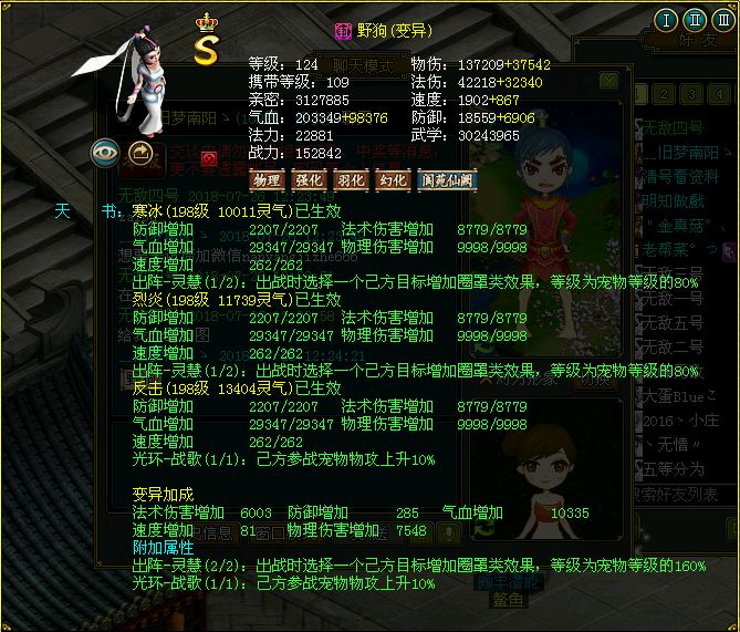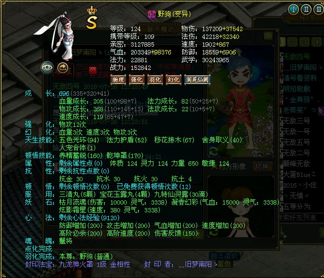 当时的它还不是满心法的,亲密也没这么高的,为了打造平民宠中的战斗宠,又开始起早贪黑给他刷亲密,喊喇叭收未鉴定收首饰喂心法,整天好不热闹。 终于它达到我满意的程度,我要带它征战武林,每天上号就在擂台下边各种PK,挑战各种不服,它也不负所望,替我打下一个又一个强大的敌人。膨胀!无限膨胀!开始挑战高等级玩家,知道被人打的灰头土脸,寿命都打完了,躲回家疗伤。 再后来出了战力系统,为了给野狗达到S战力,心里滴着血把它心法点到两百,还是不到S,队友告诉我,天书可以增加宠物战力!(丫的你不早说)二话不说买天书强天书! 不知道是谁告诉我力宝宝带五行天书,天书需要有一个法伤,这样出五行天书的时候打的伤害更爆炸,然后我的天书就成了这个样子: