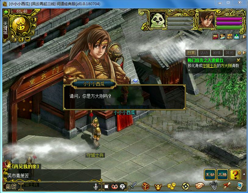 师门任务之寻找方大刚,二测中跟非经典服一样,将方大刚的位置在任务中更直接的给了出来,点击任务中的NPC名称就会自动跑到衔接桃柳林这边的城门前找到方大刚。