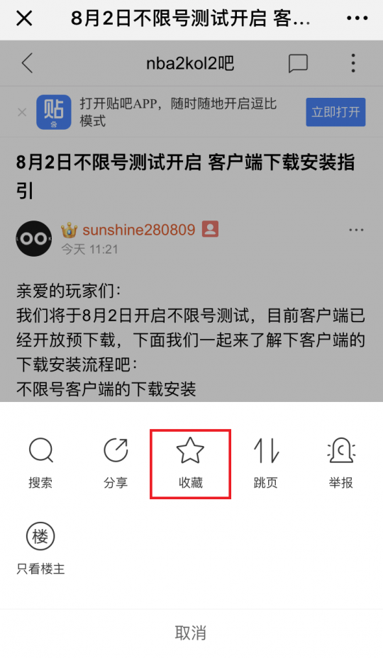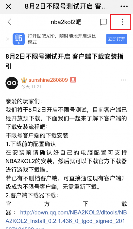 NBA2K ONLINE 2不限号测试将于8月2日正式开启,喜欢篮球的你,是时候重返球场,和兄弟们同场battle啦~ 但是很多玩家小伙伴是在手机上看到了NBA2KOL2不限号的消息,等打开了电脑,又会忘记去哪里下载客户端。小编今天就告诉大家几条小攻略,妈妈再也不担心我找不到客户端下载地址啦~ 1、云盘直接保存 微云会员用户可直接保存完整客户端,非微云会员用户因云盘容量问题将无法保存客户端,可保存客户端下载器。具体操作流程如下: 第一步: 点击上方“点击查看”,将客户端下载器或完整客户端保存至自己的微云云盘中,记得要先登录哦。 第二步: 使用电脑时,进入“微云”网页版,即可将下载器或客户端直接下载啦~ 2、进入贴吧,“马”住你的客户端 在手机上点击上方“点击查看”,即可进入官方贴吧置顶帖,点击收藏或直接回复都可以帮助你快速的在电脑上找到这个帖子哦~ 3、使用WeGame下载游戏 小伙伴们也可以在电脑端直接打开WeGame,搜索“NBA2KOL2”,即可下载客户端啦~ 小编送给大家的小攻略就是这些,球场等你,不见不散! |