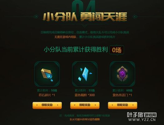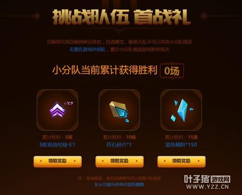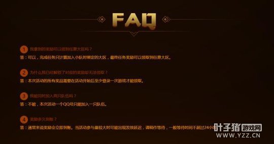 我拿到的奖励可以领到任意大区吗? 答:可以,完成任务只计算加入小队时绑定的大区,最终任务奖励可以领取到任意大区。 为什么我已经解锁了对应的奖励却无法领取? 答:本次活动的所有奖品需要在活动开始后至少登录一次游戏才能领取。 我能同时加入两只队伍吗? 答:不能,本次活动一个QQ号只能加入一只队伍。 奖励多久到账? 答:通常来说奖励会立即到账。当活动参与量较大时可能出现发放延迟,请稍作等待,一般等待时间不超过24小时。 总结 平均每人完成12场就可领取所有奖励,而活动时间长达一个月之久,总的来说,这是一个休闲玩家也能完成的任务,如果抱上大腿,那真是坐着也能领奖了~