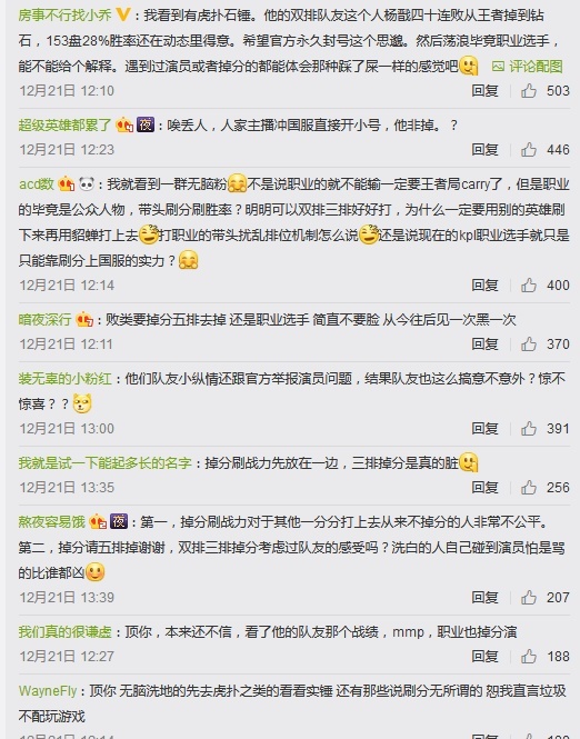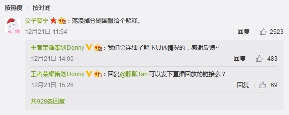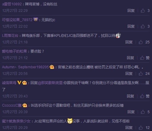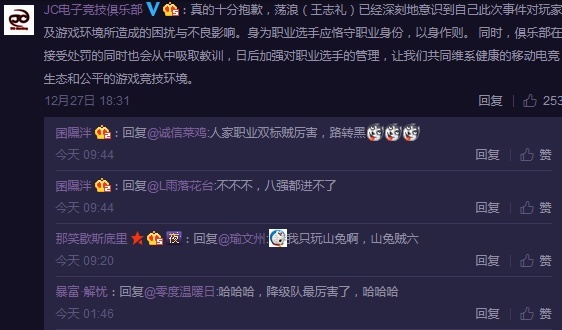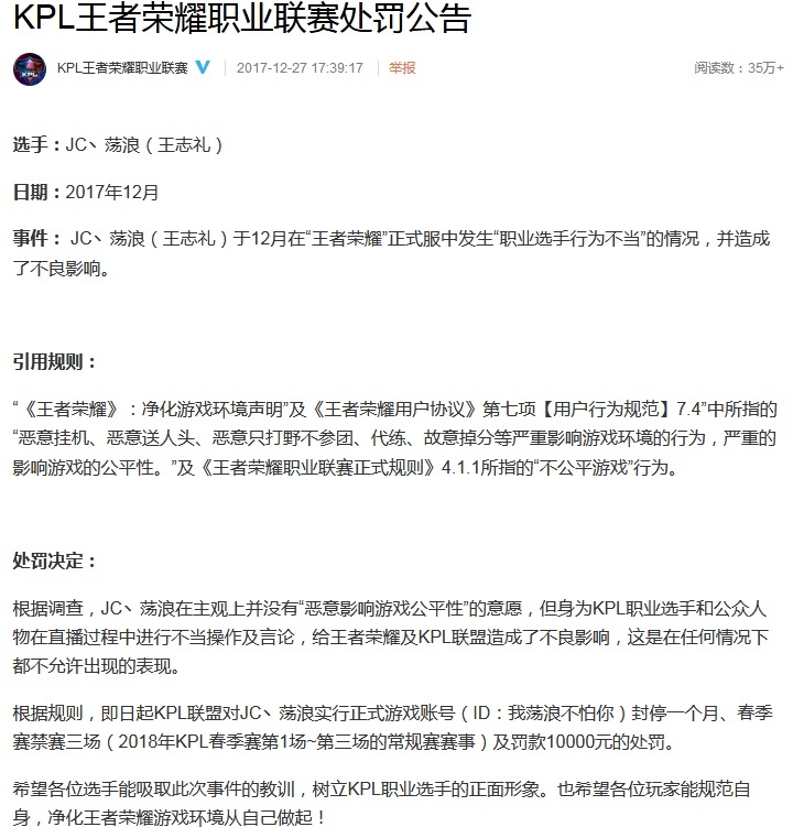 相信各位小伙伴在游戏时都会发现,由于“荣耀战力”排行系统的存在,尤其在高端局中“刷分”的现象非常严重。而近日,《王者荣耀》KPL职业联赛JC战队旗下选手JC丶荡浪被大量玩家举报“刷分上国服貂蝉”一事也炒得沸沸扬扬。 早在12月21日“王者荣耀策划Donny”的微博下方就有玩家反映了此事,而策划本人也回复了该玩家要求其提供证据: 随后在这条回复中,大量玩家做出了举报,并放出了视频地址、王者荣耀助手战绩截图等证据: 在大量证据指向JC丶荡浪确实存在刷分行为后,昨日下午“KPL王者荣耀职业联赛”官博发表了对他的处罚公告。宣布对浪荡处以正式服账号(ID:我荡浪不怕你)停封一个月、KPL春季赛禁赛三场以及10000元人民币的处罚。 在处罚公告下方,JC电子竞技俱乐部也出面道歉,但玩家们似乎对此并不买账。 平心而论,荡浪最终被处罚有很大一部分的原因在于他是KPL职业选手。由于有联赛规则的约束,职业选手在犯错后只能“挨骂要听,挨打站好”,否则职业生涯不保也不是说说而已。但说句实在的,目前游戏中不少高分段主播甚至普通玩家都存在“刷战力”的现象。在没有有效管束、举报机制不能每次都有效的情况下,我们又该如何应对? |