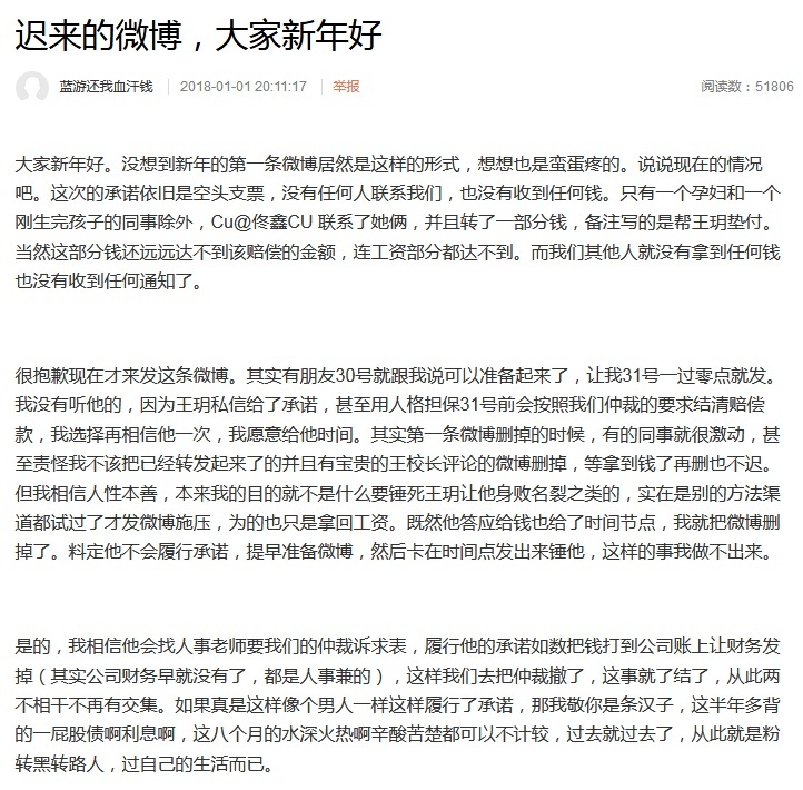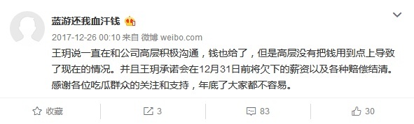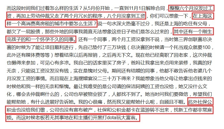 在2017年12月26日,我们曾经报道了有关《英雄联盟》Newbee俱乐部创始人“牛蛙君”拖欠旗下公司员工工资一事,ID名为“蓝游还我血汗钱”员工由于多次讨薪无果选择在微博上曝光了这件事。不过随后双方经过协商似乎达成了共识,因此该博主也删除了微博,并表示大家“都不容易”让此事告一段落。 但在1月1日晚,“蓝游还我血汗钱”再次发表了一篇置顶文章,从该文的内容来看牛蛙君并没有妥善处理这次的欠薪事件。 在声讨“牛蛙君”欠薪不还无良行为的同时,这位博主还把自己这半年来的血泪史一并曝了出来。控诉公司除拖欠工资、删除讨薪评论之外,老板在知情的情况下依然在和主播“开黑打Dota玩大富翁”: 在发出了这篇置顶文章后不久,博主还曝光了部分有关截图,包括和公司高层的聊天记录,以及牛蛙君回复他没和他联系的原因是“手机掉了上不了微博”。由于图片较多且长在这里我们就不一一放出,有兴趣的小伙伴可以自行前往微博搜索“蓝游还我血汗钱”查看详情。 截至目前,蓝游老板牛蛙君尚未对此事作出任何回应或表态。但站在一个员工的角度来看,老板有难处并不是不能体谅,如果在事前能真诚的和员工说明情况、积极解决,相信工作了这么久的员工对公司都会有一定的感情,要获得员工的理解和信任并非难事。最后,希望这次欠薪事件能够尽快得到解决,不要寒了为公司辛勤付出的员工们的心! |