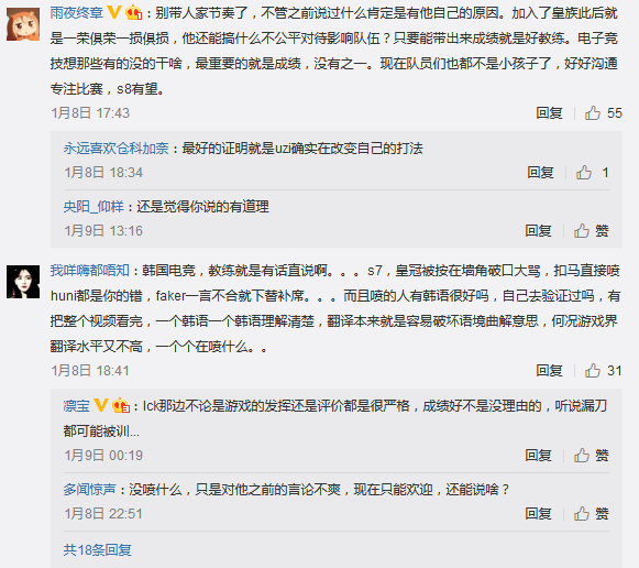 1月8日,RNG战队官博宣布了前IM教练孙大勇加入皇族并担任总教练的消息。对于这位韩国籍教练可能有些人会感到陌生,但当年IM就是在他的带领下一年内三连跳杀入世界赛,而且前任RNG教练风哥也曾公开表示孙教练算是他的恩师,所以这样一位有实力的教练加入,对RNG来说无疑是一件好事。但就在官宣后不久,却陆续出现了批评和抵制这位教练的声音,这究竟是怎么一回事? 原来此前孙大勇教练在韩国OGN的一档采访节目中曾经谈到过中国战队和选手,而且在节目中他表示Uzi对于RNG来说是绊脚石一样的存在,无法控制,并且会把自己当成“主人公”,否则就会发火: 这段采访曝光后,不少RNG的粉丝和狗粉认为他对Uzi抱有偏见,担心他成为教练后Uzi会被“穿小鞋”,纷纷在官博留言表示自己的不满: 但也有玩家表示是粉丝们太玻璃心,因为在韩国严格的电竞环境下,任何发挥不好或者状态不好的选手都会被严厉训话,连Huni、Faker等这样的明星选手也不例外: 平心而论,小狗目前的心态与S3、S4时期已经不可同日而语,现在的小狗在心态和打法上都已经成熟了很多,并且也愿意为了团队牺牲拿出功能性的英雄,这一点是所有观众都看在眼里的。不过孙教练指出选手的不足指出也并没有错,只有能够发现问题并勇于发声、勇于改变的教练才能带领队伍走得更远。最后,祝福S8赛季RNG能在孙教练的带领下取得更好的成绩! |