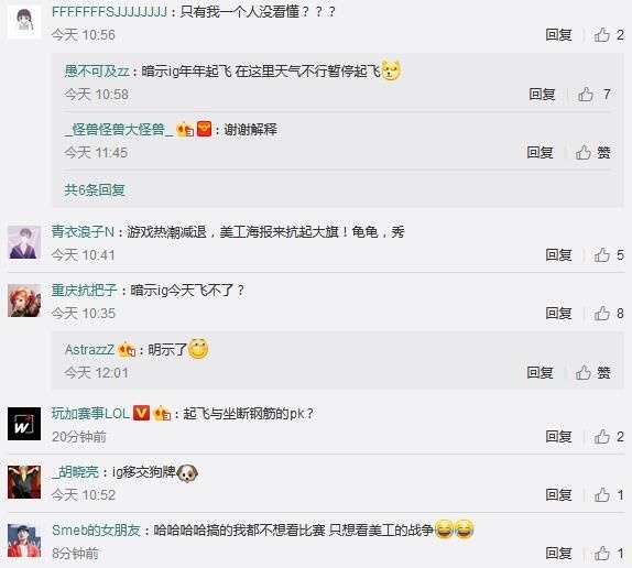 今天下午5点,《英雄联盟》LPL春季赛将迎来JDG对阵IG战队的比赛。就在今天上午10点半,JDG官博发布了赛前海报,表示“由于天气原因,所有航班暂停起飞”,用以调侃被称为“完全体”却成绩欠佳的IG战队。 当然,观众当中有部分小伙伴不明白这些梗的意思,评论区也有网友对其进行了解答: 其实这种充满创意的赛前海报已经不是第一次了,而带起这股风潮的正是前IM战队的“鬼才美工”。其实在2017年年初的比赛中,IM的海报还是挺正经的: 但在年中开始,IM官博一次次放出画风魔性到让人忍俊不禁的海报,即使在IM变成了BLG后这种风格奇葩的海报却依然保留了下来,下面我们就来一起感受一下。 或许是受到IM美工的影响,今年不少俱乐部海报的画风都变得魔性起来: 不得不说,在英雄联盟人气和热度逐渐变低的今天,这样搞怪的海报的确能吸引不少观众的眼球,甚至有网友表示“海报比比赛好看多了!”不知这种画风魔性的搞怪海报,各位小伙伴是否喜欢呢? |