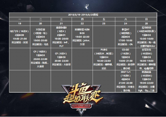 2017年7月,看准吃鸡游戏火热状态的斗鱼创新性的举办了直播史上第一个由直播平台主办的绝地求生平台自制赛——斗鱼绝地求生黄金大奖赛,并由平台主播招募站队参赛。彼时,国内吃鸡游戏大热、职业战队如雨后春笋般涌出。但由于国内缺少游戏代理与运营商的原因,绝地求生电竞市场却没有一个能叫得上名字的联赛。也正因此,斗鱼黄金大奖赛一经举办就取得了让人意想不到的成功。 这次DSL斗鱼超级联赛不仅包含了众多吃鸡爱好者所热爱的端游《绝地求生:大逃杀》,也包括随之衍生的《刺激战场》、《荒岛特训》、《全军出击》三款吃鸡手游。可以说,本次DSL斗鱼超级联赛是一场不折不扣的“吃鸡盛宴”。