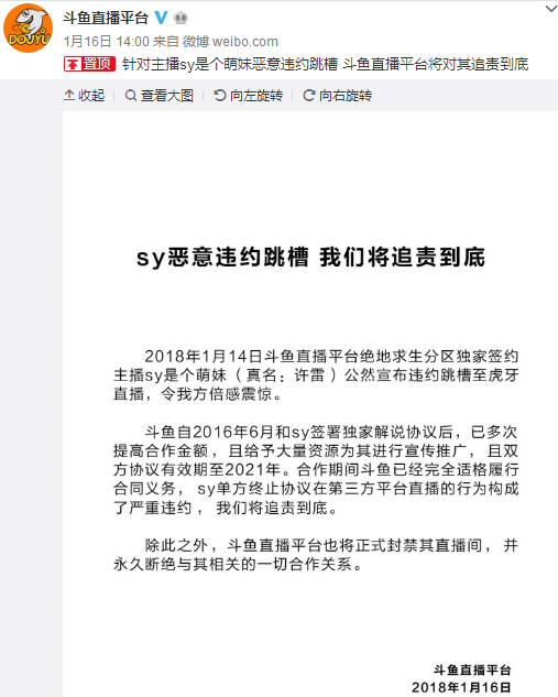最近,游戏圈可谓非常热闹。前有“斗鱼处罚五五开”一事引发热议,后有主播“sy是个萌妹”强势回应斗鱼“违约跳槽”一说,各位吃瓜群众想必很过瘾。 提起sy这位顶尖狙击手,熟悉电竞圈的人士不会陌生。作为FPS职业选手,sy在守望先锋早已赫赫有名,转战绝地求生后也展现了过人的天赋,如今已经加入4AM战队。 不过,近日网上爆料他在参加斗鱼年度盛典、领了年度优秀主播奖第二天即跳槽虎牙。此举动也引起了斗鱼的不满,声称要对sy追责到底。 斗鱼官方微博提到:“sy单方终止协议,构成了严重违约。”要知道,主播合同的违约金通常不是一笔小数目。而昨晚,sy在个人微博发表“有一些想对大家说的话”一文,对斗鱼的追责做出回应。 文章的内容很长,感兴趣的玩家可以前往@sy是个萌妹个人微博查看详情,小编就简单总结几点,不一一截图了。 1.感激斗鱼对自己能力的认可。 2.斗鱼尚未支付近几个月的直播工资和礼物费用。 3.违约金会负责,但与斗鱼的合同是1年。 4.希望斗鱼停止水军攻击、引导舆论。 另外,前段时间,sy在直播时提到了其离开斗鱼的部分原因: “不是因为钱多才跳平台的,是因为某些主播不好好直播,开了挂还请水军带弹幕节奏高人,恶心竞争,不太喜欢这样的气氛,跟斗鱼管理和利益没太大关系。宁愿低价跟4am的兄弟一起开开心心玩和直播,也不想再斗鱼自己玩自己的,跟某些开挂和某些请水军的主播勾心斗角。” 显而易见,sy离开斗鱼的原因之一是不想踏入这趟外挂的浑水——有网友戏称斗鱼“挂壁TV”,昨日斗鱼发布“五五开处罚公告”却丝毫不提外挂二字更让其陷入舆论的漩涡。而这篇文章更揭露了斗鱼曾经为人诟病的做法:拖欠工资。 事实上,斗鱼拖欠主播工资一说早有传闻,知名主播微笑、文森特、韦神等都涉身其中。因此,有网友在微博评论为曾被拖欠工资的主播打抱不平。 也有网友表示了不理解:“大平台也会欠薪?” 当然,更多网友心疼深夜发微博的sy,现4AM队友韦神更督促其“快去睡觉”。看上去,sy在新平台和新战队还是很顺心的。 当然,截止发稿之时,斗鱼尚未对sy的说法做出回应,事件的真实度有待考究。不知各位对主播sy和斗鱼之间的矛盾有何看法? |
