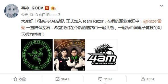 相信大部分关注《绝地求生》的小伙伴都知道韦神和他的4AM战队,这支战队也算是首批国内绝地求生职业战队。但在与前队员周莉莉(NB211)分道扬镳后,曾经战无不胜的4AM成绩也变得不稳定,最近甚至更是传出了“阿鲁卡杀队友”的传言,让不少网友都认为4AM可能“药丸”。 今天下午,韦神在微博中宣布4AM战队加入“TeamRazer”,成为雷蛇旗下的一员。在微博留言区韦神表示,将会在转发并评论此微博的网友中抽出5位送鼠标。 相比起4AM加入雷蛇的消息,评论区的网友们似乎对抽奖的礼物更感兴趣: 还有网友吐槽了一下这条微博的配图: 小编仔细打开这张图看了一下,嗯...简直毫无PS痕迹,不愧为P图鬼才! 玩笑归玩笑,4AM能够加入TeamRazer也算是一个更好的归宿,毕竟如果一直靠韦神拉赞助来支撑肯定无法稳定,而一支不稳定的队伍更是难以打出优异的成绩。希望4AM能够在接下来的日子里再接再厉,打出更多好成绩! |