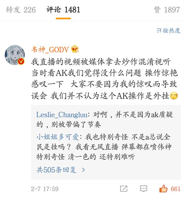 近日,全民TV的战队在绝地求生贺岁杯中疑似开挂的事件闹得沸沸扬扬,多支战队宣布退赛,Armanini更是在微博直言将放出更多、更完整的视频证明全民TV战队开挂。 全民TV贺岁杯也算是比较大型的国内绝地求生赛事了,事件刚发生,消息就传遍整个吃鸡届,一时之间全民TV战队犹如过街老鼠——人人喊打。然而,圈内大佬午后狂睡在认真分析了部分视频片段后,却得出“没有开挂”的结论。 随后,LGD战队的教练梦晴也表示,这波操作确实没有问题,高手确实能做到,开枪频率很慢,并不需要压枪多好。 在船上被团灭的VG战队则在微博解释道,这件事VG没有带任何节奏,也没有要锤全民TV战队,比赛也没有退赛,只是参加的队伍太少赛事延期了。 事件发生的第二天,一个名为《5Feng直播第一视角与比赛replay对比》的视频在微博上迅速传播开来,视频分析了无风部分打地、打箱子、报点行为,并得出了无风使用透视的结论。网友们纷纷表示,这下没得洗了。 面对质疑声,无风在直播中详细解答了扫地、打箱子、报点准确等操作的理由,并回答了观众提出的所有质疑点。 当晚韦神也发微博澄清,“当时看AK我们觉得没什么问题,操作惊艳感叹一下,大家不要误会,我们并不认为这个AK操作是外挂。” 转眼已到事件发生的第三天,按照以往的经验,应该是多方实锤的总结时间了,然而网友们等来的却是全民TV被洗白的消息。OMG林大表示,自己熬夜看完了全民TV战队四个人的全部视角,没有发现问题。 MDY俱乐部对退赛行为公开致歉。 NW俱乐部对退赛行为致歉,并表示已经教育过选手。 而最先退赛的Armanini,直到现在也没有拿出 “实锤”分析。不过质疑的微博依旧没有删掉,小编猜测可能是在整理更多的证据。 各位小伙伴们,你们认为全民TV的战队有没有开挂呢? 了解更多相关信息,请前往http://game.yzz.cn/html/info-5304.html |