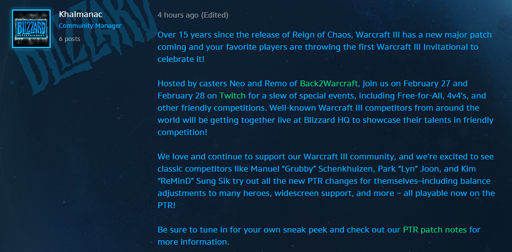 前几日,暴雪向世界各地的最佳《魔兽争霸3》玩家和职业选手发出了线下活动的邀请函,《魔兽争霸3》将要重制的消息也因此传的沸沸扬扬。然而今日暴雪官方却宣布是要在本月27~28日举行一场《魔兽争霸3》邀请赛,让期盼重制版的玩家们失望不已。 在公告中,暴雪表示自从《混沌之王》发布15多年后,《魔兽争霸3》将迎来一个新的大补丁,各位玩家所喜欢的选手也会参加这次魔兽争霸邀请赛来庆祝它!本次邀请赛包括混战,4V4和其他友谊赛。世界各地著名的魔兽争霸3选手将聚集在暴雪总部,在友谊赛中展示他们的天赋。 虽说本次比赛中没有中国选手参与,不过值得一提的是原韩国职业选手“美兽王”Lyn将代表中国队参加。Lyn去年12月在成都和中国妻子完婚,这是要用中国女婿的身份参赛吗? 完整受邀名单如下: Neo [Observer]德国 Remo [Observer]德国 Happy [Undead]俄罗斯 Foggy [Night Elf]乌克兰 HawK [Human]俄罗斯 Effect [Human]瑞典 ReMinD [Night Elf]韩国 Lyn [Orc]中国 FoCuS [Orc]韩国 LawLiet [Night Elf]韩国 Grubby [Orc]荷兰 MaDFroG [Undead]瑞典 Insomnia [Human]保加利亚 Tak3r [Orc]德国 了解更多相关信息,请前往http://game.yzz.cn/html/info-73.html |