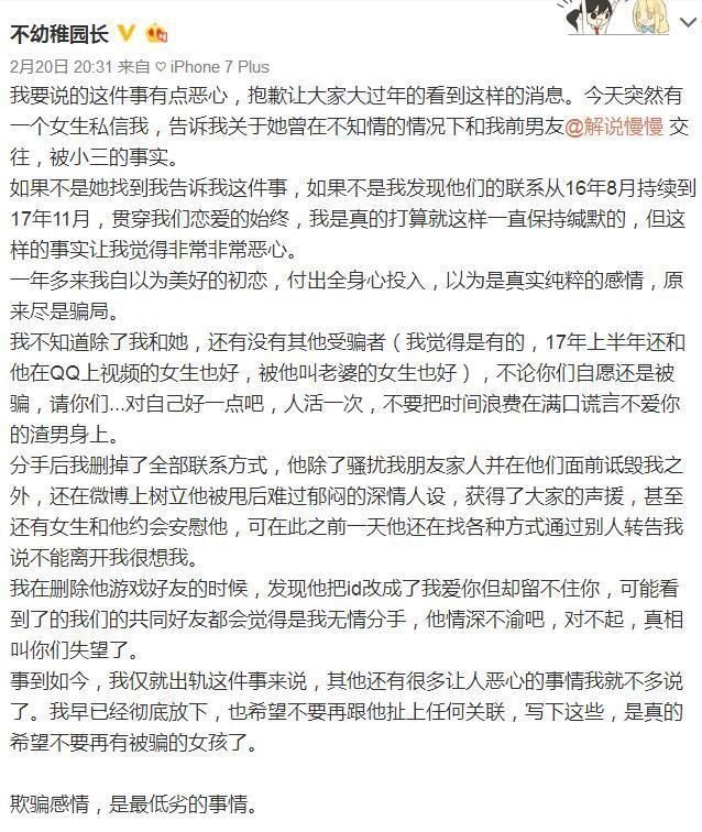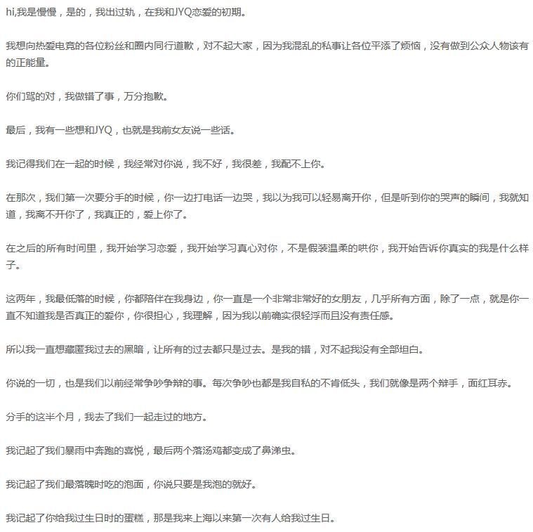 几天前,《英雄联盟》解说慢慢的女友在微博上爆料称其出轨,并且发出了几张图片作为“罪证”,瞬间引发了大量网友的讨论。 据慢慢女友表示,除了她和与她私聊的这位女生之外,慢慢可能还有其他的暧昧对象,而且微博中那句“其他还有很多让人恶心的事情我就不多说了”,更是给围观群众们留下了无限的想象空间。 就在今天凌晨,解说慢慢本人在微博上发布长文回应此事: 在微博中,慢慢承认自己在与女方恋爱期间有过出轨行为,并向女方道歉。不过对于慢慢的道歉,网友们似乎并不买账,认为他是在借这次道歉来为自己洗白,并称这篇文章为“渣男道歉模板”。 目前慢慢已将该微博删除,但网友们对于此事的讨论却仍未停止。不知对于慢慢的这波道歉,各位小伙伴怎么看? |