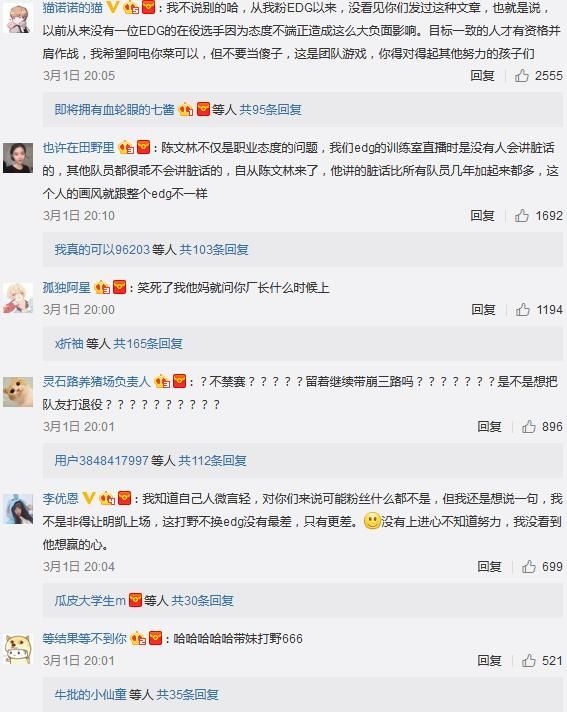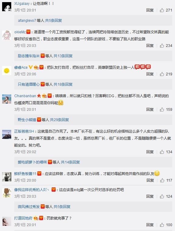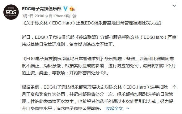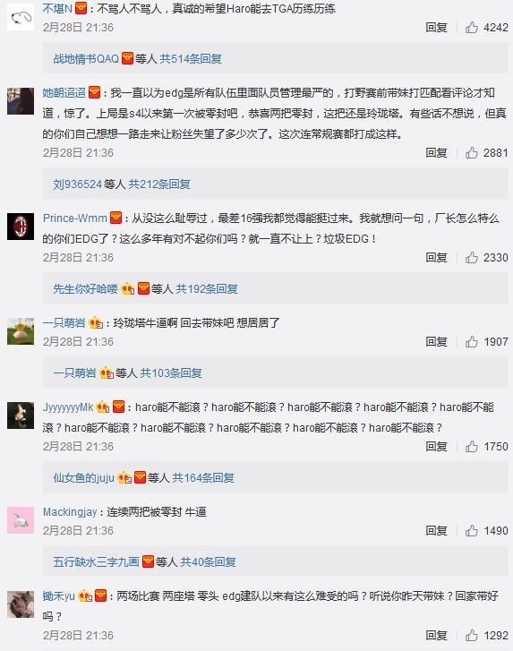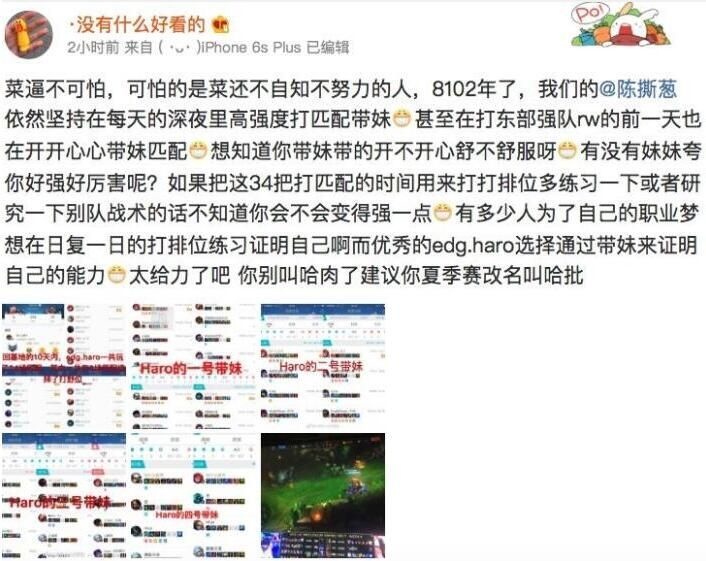 2月28日《英雄联盟》LPL春季赛的比赛中,LPL新军RW正面迎战EDG,在这场比赛开始前大家都非常期待老牌劲旅和黑马队伍的交锋。但出人意料的是,EDG却在本场比赛中连续被RW零封两场,第二场甚至被打成了零人头、零大小龙、零防御塔的惨烈战绩。 赛后EDG官博被不少愤怒的粉丝爆破,其中被玩家骂得最惨的莫过于今年启用的新人打野Haro。 当S7结束后厂长再度退隐时,EDG从青训队中启用了新人打野Haro。虽然Haro在德杯首秀的表现还算可以,但由于大赛经验不足的关系,在进入LPL后比其他队伍的打野都要逊色不少。在此前EDG成绩尚可时大家都还觉得可以接受,但当28日晚EDG遭遇建队以来首次被零封之后,粉丝们心中的怒火便找到了一个宣泄口般一发不可收拾。无论是在贴吧、论坛还是EDG官博下方,对此次比赛的讨论和对Haro的质疑声都不绝于耳。 正所谓“屋漏偏逢连夜雨”,在输掉比赛后不久有网友爆出了Haro的各种黑料。根据一位名为“没有什么好看的”的网友表示,Haro在与RW比赛前一天还在深夜带妹匹配,并放出了战绩截图。 尴尬的是在这之后,网友们找到了当事妹子的微博,发现这妹子居然是Haro曾经在青训队里上单位队友的女朋友... 随后又出现了更多爆料,称Haro原来在青训队时就非常喜欢带妹,被他带过的妹子不在少数,并且还有妹子在抗压吧爆料: 就在昨晚,EDG官博发表了一篇名为“关于陈文林(EDG.Haro)违反俱乐部日常管理准则处罚决定”的文章,宣布对Haro“备赛、训练和比赛期间态度不端正、消极怠慢”的行为作出处罚,扣除一个月工资以及奖金,并作出内部警告处分。 不过对于这次EDG的处理决定,还是有不少粉丝表示不买账。评论中不难看出网友们认为这次处罚太轻,不足以解他们的“心头之恨”。 不知对于这次EDG方面对Haro的处理,各位小伙伴认为是否足够?而在队伍状态如此低迷的情况下,待明凯回归后又是否能止住EDG的颓势?欢迎说出你的看法! |