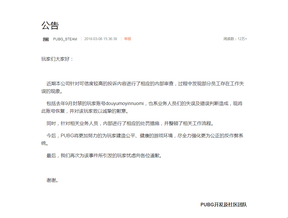 今天早上8点,《绝地求生》官方为了更新反外挂措施再一次对服务器进行了停机维护。就在中午12时29分,官博“PUBG_STEAM”发公告称正式服停机维护已经正式结束。 对于这次蓝洞针对反外挂系统进行的维护,不少玩家表示支持,还声称“可以安心上两天分了”。 不过事实证明我们还是太年轻了,因为外挂制作者的更新效率竟然要远高于官方!就在官博的更新公告评论区中,有玩家发出了这样的一张截图: 从截图中的时间来看,该外挂群的管理员在中午12时13分就宣布了软件更新完毕的信息,而官博发布的游戏更新完毕时间是12时29分,这也意味着说外挂制作者的更新速度要比官方还快13分钟... 虽然外挂制作者的更新效率令人瞠目结舌,但反观这次蓝洞2G之多但却毫无用处的反外挂更新也颇有些“马奇诺防线”的味道。在更新后不久官博迅速被愤怒的玩家爆破,不少人前来吐槽这次更新“除了让游戏变卡之外毫无用处”,甚至还有外挂作者肆无忌惮的兜售外挂... 当小编找到这款外挂的官网后发现,在官网上不仅标注了“内部辅助”四个大字,同时还声称“稳定半年,从未封号”,甚至还打出了让人无比心动的承诺。虽然这或许只是宣传手段的一部分,但如果事实的如此,那或许蓝洞外挂屡禁不止的问题也不难解释。 更令人哭笑不得的是,在这篇文章发布前10分钟,官方发布了一条道歉公告表示玩家“douyumoyinnuomi”被封号系误判。随着蓝洞的这一纸声明,意味着魔音糯米这个被称为“史上第一个被锤死的挂壁”成功洗白。 虽然我们也能看到蓝洞在解决外挂问题上做出的努力,但每次的希望都被外挂制作者无情打脸,连刚刚更新后都无法保证体验无挂游戏。但我们在“哀其不幸,怒其不争”的同时又是否考虑过,外挂屡次神速更新的背后究竟是否真的有蓝洞的内鬼为虎作伥?如果事实真的像蓝洞某金姓员工前女友爆料那般,那么谁又该为正常玩家的游戏体验买单呢? |