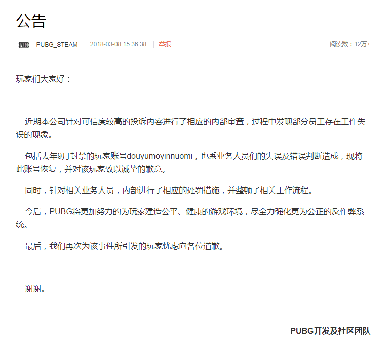 最近半年,现象级游戏《绝地求生》成就了一批游戏主播,但也有不少主播因为开挂被实锤而彻底凉凉,其中不乏多个平台一哥。 不管这些主播人气再高、势力再大,被实锤了就再无翻身可能。除了今天的主角——魔音糯米。 今天下午3点半,绝地求生官方微博发布公告,称去年9月封禁的玩家账号douyumoyinnuomi属于误封,现将账号恢复并对该玩家致以诚挚的歉意。 公告原文如下 玩家们大家好: 近期本公司针对可信度较高的投诉内容进行了相应的内部审查,过程中发现部分员工存在工作失误的现象。 包括去年9月封禁的玩家账号douyumoyinnuomi,也系业务人员们的失误及错误判断造成,现将此账号恢复,并对该玩家致以诚挚的歉意。 同时,针对相关业务人员,内部进行了相应的处罚措施,并整顿了相关工作流程。 今后,PUBG将更加努力的为玩家建造公平、健康的游戏环境,尽全力强化更为公正的反作弊系统。 最后,我们再次为该事件所引发的玩家忧虑向各位道歉。 对此,有知名选手在官方微博下方回复,表达了自己的不满,认为官博就是一个笑话。 回顾魔音糯米开挂事件,其实他并没有一些被实锤主播的夸张到吓人的操作,线下自证虽然没有完美还原8倍镜AK压枪扫车的操作,但众多职业选手也承认魔音糯米具有一定游戏水平。 真正锤倒他的,是绝地求生官方在2017年9月8日发布的一个微博,“进行了反复细致的对比和检测,确认账号:douyumoyinnuomi,有多次使用外挂的记录,因此我们队该账号进行了永久封禁的处理。” 官方自己打脸的操作确实令人想笑。现在看来,官方的封禁也不能算作实锤了,大解封的时代即将到来? 各位小伙伴,对魔音糯米被解封的事情你怎么看?欢迎在评论区留言讨论。 了解更多相关信息,请前往http://game.yzz.cn/html/info-5304.html |