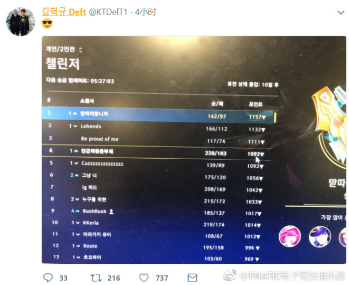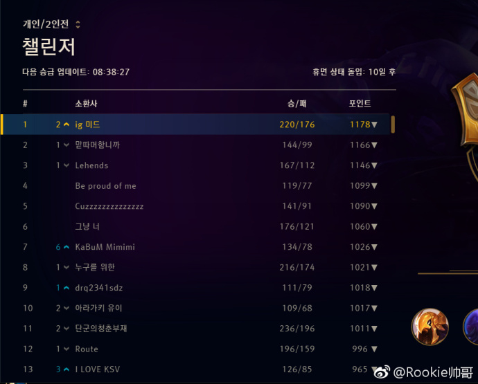 LOL韩服一直是高端玩家和职业选手向往的竞技天堂,甚至有人称韩服的钻一水平可以媲美国服王者。不少职业选手为了保持良好的状态,都会选择在韩服打排位,韩服第一的宝座也被视为无上的荣耀。 前日,KT战队的Deft在韩服排位中打上1157分,成功登顶第一。比赛中他与mate下路的精彩表现也十分亮眼,给观众留下深刻的印象。同为ADC,UZI看见排名后也称赞Deft真的是太强了,这排位分高的恐怖。 然而Deft在第一的位置上还没坐稳,就被另一名选手所超越。今天下午2点,IG的中单选手Rookie发微博称:新的一年又回到第一啦嘻嘻嘻可以吃饭了。并晒出了韩服排名截图: 从图中我们可以看出,两日前仅有1042分的IG选手Rookie,目前以1178分位居榜首。我们都知道今天正好是IG选手小孩游神的退役的日子,相信这也是Rookie送给队友Kid的一个完美的退役礼物。 另外在粉丝群中,Kid表示“今晚对阵BLG的比赛中,如果第一场比赛胜利,自己将会上场。”就让我们一起期待晚上的比赛中,IG战队的表现吧。 值得一提的是,UZI的ID也出现在了韩服排行榜前列,并占据了第七的位置。不得不说UZI的手感保持的相当好,刚回基地时他的韩服段位只有钻2,这么快就冲到了1026分,不愧为国服第一ADC,相信不久之后就能发起向韩服第一的冲击了。 各位小伙伴,你们更喜欢哪位选手?欢迎在评论区留言讨论。 了解更多相关信息,请前往http://lol.yzz.cn/ |
