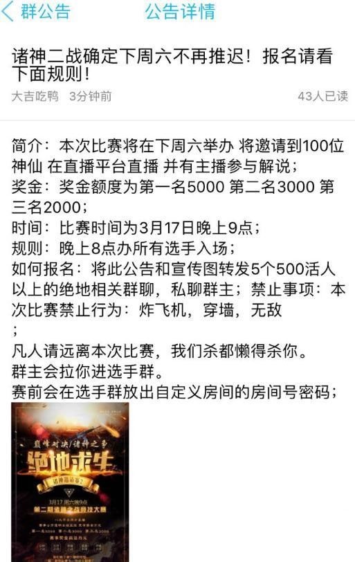 自从《绝地求生》大热以来,蓝洞官方和外挂制作者们的斗争就从未停止过。虽然官方频繁的推出反作弊机制更新,但每次的交锋都以外挂作者胜利而告终。不久前就有外挂玩家举办过一场仅对外挂使用者开放的“诸神之战”,而近日有消息表示,这比赛居然还要办第二次! 相比起第一届诸神之战略显寒酸的500元奖金,这次的“诸神之战”则要高出不少,不仅冠军能够获得5000元RMB的奖励,亚军和季军也分别能够获得3000和2000的奖金!并且从曝光的公告上来看,这次比赛居然还邀请到了主播参与解说... 当然了,在赛制方面这次的比赛也要比第一届“严谨”不少,不仅限制了100位参赛选手的最迟到长时间,甚至还规定禁止使用“炸飞机”、“穿墙”以及“无敌”等外挂。不过与第一次比赛相同的是,这次比赛同样提醒了“凡人”玩家不要涉足,举办方表示“我们连杀都懒得杀你”! 在目前官方和各大直播平台的严打之下,小编认为这场比赛能够顺利举办并直播的可能性不大,但面对着外挂作者和使用者如此嚣张的气焰,难道真的没有人能够出面打击一下?不知各位小伙伴对这次的“第二次吃鸡诸神之战”有何看法?欢迎说出你的观点! |