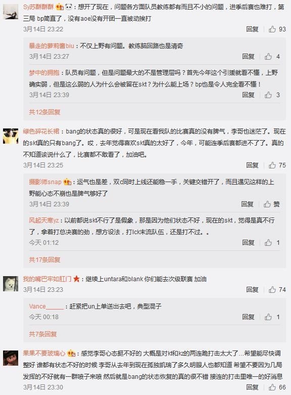 在昨晚《英雄联盟》LCK赛区SKT对阵BBQ的比赛中,昔日霸主SKT爆冷以1:2的成绩不敌联赛末流队伍BBQ。在丢掉了这场比赛的胜利后,SKT进季后赛的希望也越发的渺茫。 在比赛后的镜头画面中SKT全员的申请都非常没落,Faker和Wolf面无表情的收拾起自己的外设,打野Blank、上单Untara以及Bang都忍不住的抹起了眼泪。 在SKT失利后,负责LCK赛区的英文解说PapaSmithy在推特上发表了个人的看法。她认为:“SKT再一次发现——到了常规赛第八周的周中,他们似乎依然不知道他们的最佳首发五人是谁,这简直太疯狂了。当然了,BBQ今天的确是超水平发挥了,不过也许我们都还没有看到两支队伍最后的终极形态。” 除此之外,ESPN撰稿人Tyler Erzberger也在推特上吐槽SKT。他表示:“现在SKT已经6胜9负了,即使他们赢下后面所有的比赛,最好的结果也只是9-9了。今年的Faker打出了他在LOL职业赛历史上最糟糕的表现,这TM到底是怎么回事?” 曾经我们认为“SKT不行了”的时候,SKT只是状态不好或者由于版本变动需要一定时间适应,但从今年春季赛的效果来看SKT的硬实力的确出现了问题。在官博下方,不少粉丝都认为Faker开始失去了对中路的掌控能力,新人上单Untara和打野Blank更是饱受诟病。 事到如今,SKT进入季后赛也仅剩理论可能,究竟在夏季赛中SKT能否调整好状态,并如愿杀入世界赛?不知对于SKT开赛至今的低迷状态,各位小伙伴又怎么看?欢迎说出你的看法! |
