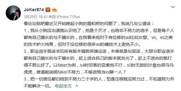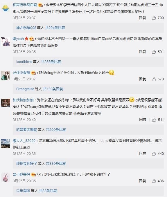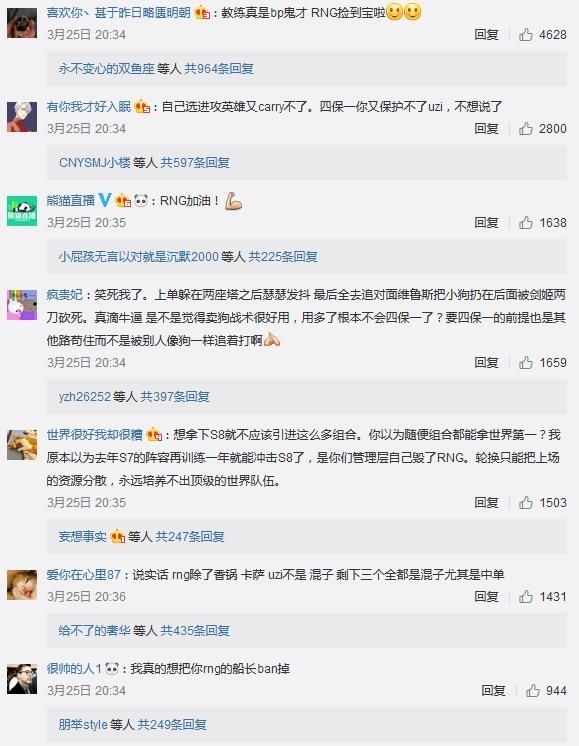 在不久前《英雄联盟》春季赛RNG对IG的比赛中,IG仅用了50分钟便赢下了对战,以2比0的比分横扫了RNG。正是因为这次惨败,导致RNG粉丝们对队员以及教练组再次发起了一波声讨,而这次被讨伐的重心则从此前的Letme、小虎等人变成了RNG队内的灵魂人物——Uzi。 在RNG官博的下方充满了粉丝们的指责,不少网友也在指责今年RNG的战术体系有问题: 甚至还有不少人提起了Uzi的英雄池问题,认为小狗不玩烬和霞让RNG在BP上先输一分,导致整个队伍的BP策略受到限制,对此,前WE教练Joker在微博上为小狗鸣不平。 Joker表示:“小狗是个天才,也绝非不努力的选手,但是每个人都有自己擅长不擅长的,他对没位移的AD英雄技术方面的确逊色不少。” 相比起去年S7时的辉煌表现,RNG在本赛季的状态的确下滑了不少。虽然在Uzi伤愈归来后曾带领队伍拿下一波连胜,但随着赛程推进,RNG其他位置选手的弊端以及战术体系上的问题越发明显,这也导致RNG在最近又尝到了失败的滋味。希望RNG的选手们以及教练组能够早日调整,争取杀进季后赛并打出更好的表现! |