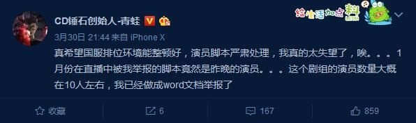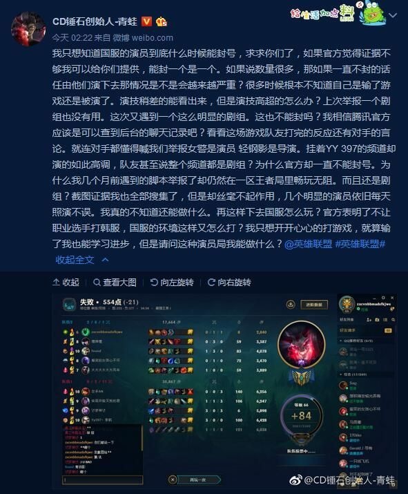 由于大量剧组和演员的存在,《英雄联盟》国服的高端排位赛中的游戏体验十分糟糕。因为即使强如职业选手一般有着过人的技术和心态,但在数量众多并且演技精湛的剧组面前依然败下阵来,因此大批职业选手选择前往韩服训练,不少主播的高端局直播也选择在韩服。 但这样的做法并不能够阻止演员们继续肆虐国服,而选择留在国服的玩家和选手们则深受其害。今日凌晨,主播青蛙在使用自己大号上分时连续遇到剧组,忍无可忍之下选择在微博进行曝光。 从对话截图我们可以看到,在这一场里一起游戏的两位玩家也明确表示这些人是剧组,并且还是惯犯。 在这次的爆料中,青蛙痛斥一区演员猖獗,并表示有部分演员在经历过自己的多次举报后依然每天照演不误。在这条微博的最后青蛙还无奈的说到:官方表明了不让职业选手打韩服,国服的环境这样又怎么打?我只想开开心心的打游戏,就算输了我也能学习进步,但是请问这种演员局我能做什么? 当然,这并不是青蛙第一次因为国服高分局演员情况发声。此前他也曾多次在微博上表示遇到了剧组,但同样是经过多次举报,这些演员依然安然无恙的在高分局中继续着他们的“表演”。 自从LOL爆红后至今,演员问题一直伴随着国服的高分局,好不夸张的说这颗毒瘤已经毁掉了国服的高分段排位赛。没有人喜欢失败的滋味,但更加没有人喜欢在一场不公平的对局中失败。遗憾的是,这样的情况在国服的高分段排位中每天都在发生,究竟官方何时才能解决演员泛滥的问题,还我们一片清净的游戏环境? |