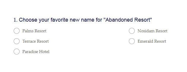 目前在《绝地求生》中拥有两张不同的地图,一张是初始的绿洲地图,另一张则是后续追加的沙漠地图。由于不少玩家对初始地图情有独钟或已经玩成了习惯,因此在沙漠地图推出后曾一度出现大量玩家遇到沙漠地图就秒退的情况。为了能够有更多的地图供玩家们选择,官方也正在摸索推出更多的可选地图。 此前在测试服中,官方已经推出了两轮有关新地图的测试,并且在4月19号就曾放出了即将开放地图选择功能的公告。 在这条公告中不仅详细解答了有关地图选择系统的相关问题,同时还放出了地图选择的界面供玩家们参考。 就在今天下午13点,官方再次发表动态,公开向所有玩家征集新地图(代码:SAVAGE)中的“Abandoned Resort” (遗弃的度假村)地区命名。玩家们可以通过点击公告中的网址来进入投票页面,为五个候选名投票并将得票数最高的名字作为这一区域的名字。 各位有兴趣的小伙伴不妨自行前往《绝地求生》官博下方寻找投票链接,说不定你喜欢的名字就会被选上,在新地图中我们就能够玩到自己命名的地区了! |