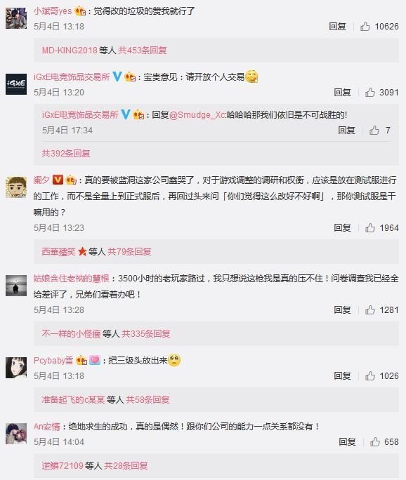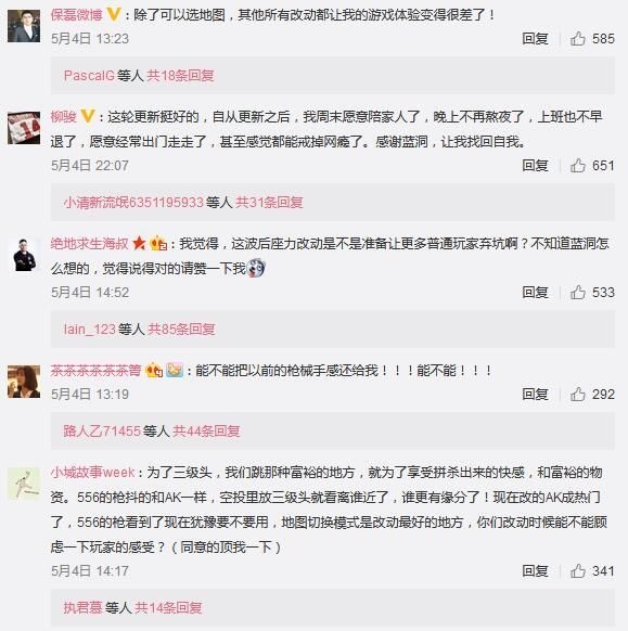 5月4日,《绝地求生》第12轮改动正式上线。在这次更新中加入了不少让玩家无法接受的改动,有部分玩家认为游戏修改后流畅性变差,也有部分玩家认为关于武器的修改不合理,并且一直以来都存在的反外挂太渣、服务器优化差等问题也同样在被提起。 从大部分留言来看,5.56口径枪械削弱是被大量玩家提到的,例如此前的神器M16三连点后坐力加大,M4满配后的手感变差等问题。 而且在5月3日关闭了交易系统后,玩家们也一直在对此问题进行反馈。虽然蓝洞方面表示关闭该系统是因为它被第三方平台滥用,但玩家们却对这种说法不买账。 而在《绝地求生》官博下方的评论区中,也充斥着大量玩家们的差评留言: 不知各位小伙伴对绝地求生的地12轮更新有什么看法?欢迎评论说出你的意见! |