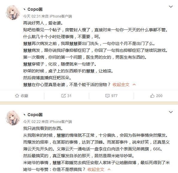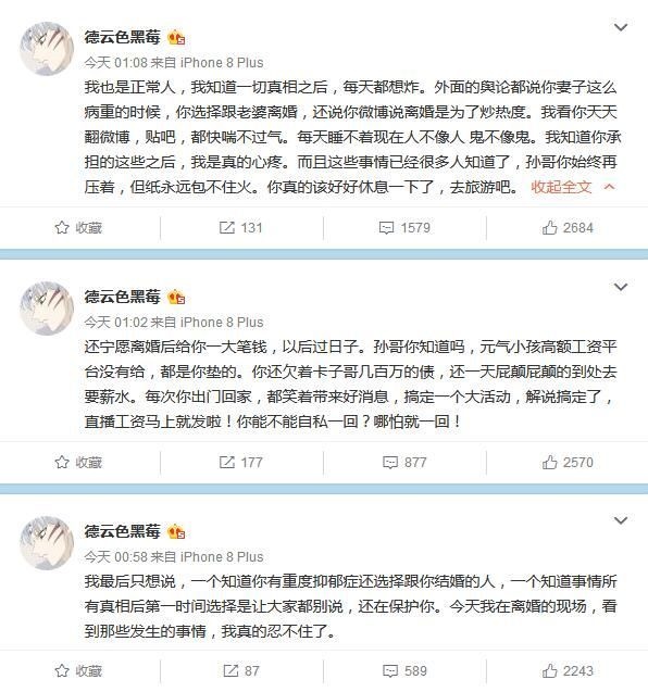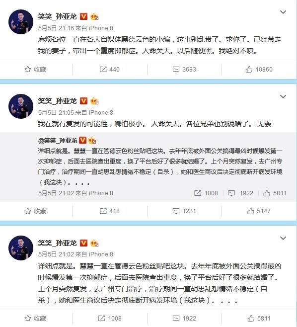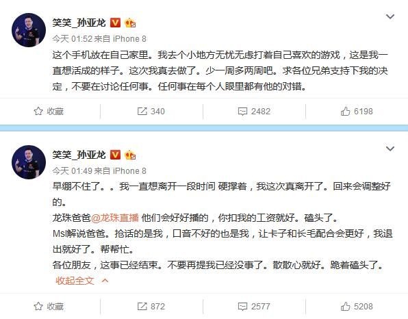 最近这两天,《英雄联盟》前IG战队职业选手、人气解说孙亚龙与妻子慧慧结婚仅几个月就离婚一事被炒得沸沸扬扬。 根据笑笑本人透露出的说法来看,离婚的原因是由于慧慧患有严重的抑郁症,而且由于笑笑职业的关系一直有不少喷子在网上对他们进行人身攻击。按照慧慧现在的状况,必须离开引发病情的源头(孙亚龙)接受治疗,因此二人选择离婚。 但就在今天凌晨,笑笑的助理“德云色黑莓”在自己的个人微博上突然向慧慧发难,曝出二人离婚的真正原因竟然是女方在婚内出轨! 在曝料的同时,黑莓还附上了一位与慧慧成为了闺蜜的德云色粉丝和她的聊天记录: 随后黑莓还对慧慧声称抑郁症发作的时间点进行了质疑,并且还指出慧慧所谓去深圳治疗抑郁症有蹊跷,因为传言中的出轨对象正好就在深圳。 在爆料的最后,黑莓还连发三段文字痛斥慧慧,以及透露出了心疼笑笑一人承担所有事情的做法。而大量德云色的粉丝们也也站了出来表示力挺笑笑,同时纷纷斥责慧慧的做法太过无耻。 另一方面,孙亚龙本人也在微博上表示要离开一段时间,要“手机放在自己家里。我去个小地方无忧无虑打着自己喜欢的游戏”,并且透露出了近段时间自己不会直播,并且连Msi解说一职也将放下的消息。 暖心的是,在孙亚龙的微博下方,不少电竞圈内的元老级人物在第一时间出现,并给与了笑笑声援与安慰。 在另一边,身为慧慧粉丝的“COPO酱”在看到黑莓爆料后也站了出来,并且列举了部分证据,指责慧慧的确患有严重的抑郁症,并且正是由于孙亚龙的压迫所导致。 不过相比起黑莓的指责,Copo酱的这些反击显得有些苍白无力,网友们的评论也多数持怀疑态度,并且还暗示她在微博中放出的聊天记录截图和时间是伪造的。 耐人寻味的是,此前称自己“因为治病手机要被没收”的慧慧却在凌晨1点13分突然发表了一条微博,疑似对此事进行了回应: 虽然这条微博为设置为无法评论,但依然无法阻止网友们对她“抑郁症”的怀疑,在转发量最高的一条转发动态里,一位网友说出了自己的质疑: 虽说今年的电竞圈的确不太平,从直播开挂、兄弟反目、情侣分手到家人出现意外等情况接连出现,但不得不说笑笑这次的离婚大料堪称“拳打五五开,脚踢王记得”,任何此前事件的劲爆程度都无法与这次的风波相比。不过面对现在双方各执一词的情况,我们也很难分辨究竟谁对谁错。对于这次的时间我们也将保持关注,欢迎各位小伙伴在评论区中说出自己的看法! |
