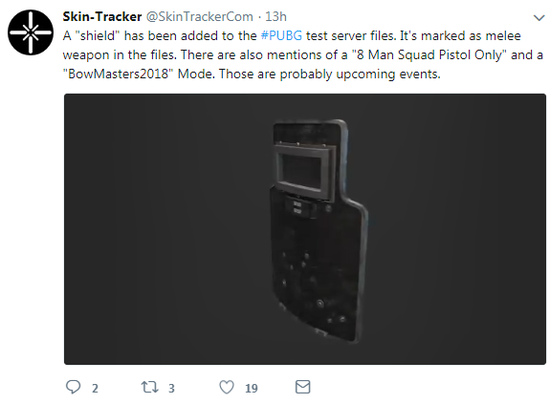 近日,来自国外数据网站“Skin-Tracker”上的国外网友发掘了《绝地求生》的游戏文件,并在文件中找到了即将在未来加入游戏的新装备——盾牌。 据悉,盾牌在游戏中被标注为“混战武器”。除此之外,在爆料中还提到了“8人手枪团队模式(8 Man Squad Pistol Only)”以及“弓箭大师2018(BowMasters2018)”等新模式玩法。或许在日后的游戏更新中,这些新玩法将会出现在我们面前。 从曝光 的截图来看,这款防暴盾牌应该是一块全身盾,并且在盾牌的正面还有很多被子弹击中过的痕迹,看起来非常的真实。不过除此之外,这次曝料并未涉及更多的其他内容,让我们一起期待吧! |