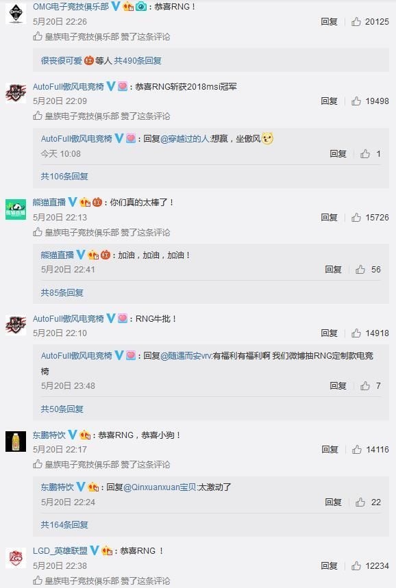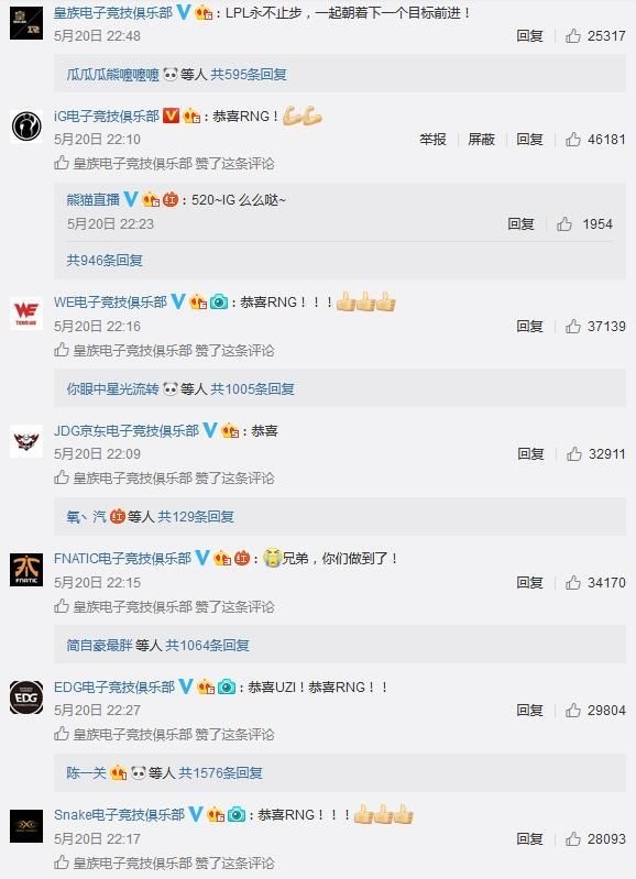 在昨天结束的《英雄联盟》季中邀请赛决赛中,RNG以3:1的比分成功击败来自韩国的KZ战队夺冠。而让这场比赛更加具有纪念意义的是,它是RNG当家AD选手Uzi的首个世界赛冠军! 在这场比赛中,RNG全员发挥都非常出色。上单Letme在面对赛前叫嚣“要让全世界上单在我面前跪下”的Khan丝毫不虚,中野小虎和Karsa的组合多次洞悉BDD和小花生的战术意图,而下路的双人组Uzi和Ming则几乎全程碾压了玄冥二老。除了第二场后期阵容无力遗憾落败外,其他的三场RNG均以较大的优势拿下。 在RNG夺冠后不久,共青团中央官博也发布了动态祝贺RNG夺冠,给予了他们最大的肯定。 而在RNG的官博下方,各大俱乐部也都第一时间献上了自己的祝福。 有趣的是,被称为“中欧电竞外交大使”的FNC官博和推特都非常皮,有网友爆出了FNC官推在比赛前发表的动态,深得国内骚话的精髓。 在这个全民狂欢的日子里网友们自然也不会闲着,比赛刚刚结束,各种表情包就在各大贴吧论坛中疯传。 当然,在庆祝RNG夺冠之余我们也希望小伙子们不要松懈,希望他们在接下来的夏季赛中能够不骄不躁、继续努力,争取让S8的世界赛现场再下一场金色的雨! |