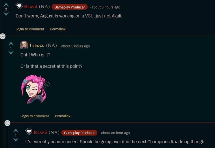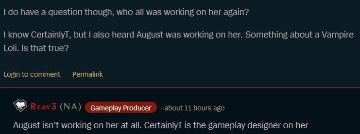 相信LOL玩家们对阿卡丽这个英雄都不会陌生。在我们刚刚接触英雄联盟时,这个6级之后爆发恐怖的刺客给我们带来了深刻的印象。不过受制于版本,阿卡丽现在在比赛中完全无法登场,并且在路人局中的登场率也不高。近日,拳头正式将阿卡丽的重做提上了日程。 今天,《英雄联盟》英雄设计团队负责人Reav3确定,阿卡丽操刀将有设计师CertainlyT负责。 CertainlyT是一位资历非常老的设计师,他曾经着手负责了诺克萨斯之手、荆棘之兴、魂锁典狱长、复仇之矛、疾风剑豪以及暮光星灵等英雄的设计,并且参与了莫德凯撒和格雷福斯的改版重做。经过他手中设计出或重做的英雄都非常有特色,并且一般都带有非常耐玩的机制,堪称是一名不可多得的LOL英雄设计师。而高机动性的刺客在CertainlyT的手中将会被改动成怎样?玩家们都非常好奇。 在此前的英雄联盟蓝图中官方曾经曝光,W的烟雾弹技能将会成为阿卡丽的核心技能,相信这次改动的核心也会围绕着该技能进行调整。或许在改版后阿卡丽的烟雾弹将拥有全新的机制,让她变得更加灵活。 除此之外,Reav3还表示另一位设计师August在负责另一位英雄的重做,但目前这个项目尚未公布。 从时间节点上来看,在暗裔剑魔重做后,下一位登场的重做英雄应该就是阿卡丽了。除了阿卡丽之外,雪人骑士努努也在重做中,因此现在正在重做的这位神秘英雄或许将在阿卡丽重做上线后公布。不知道大家认为重做之后的阿卡丽将会有哪些不同?欢迎说出你的看法! |