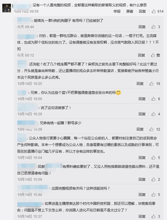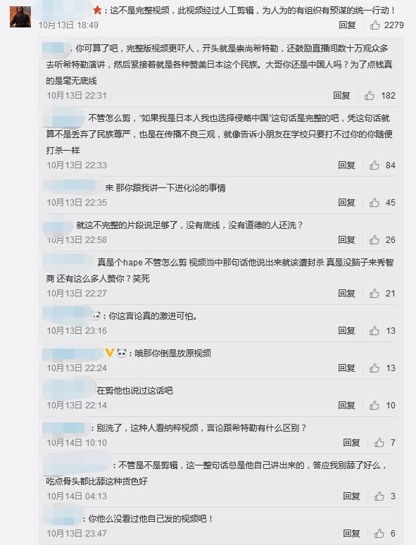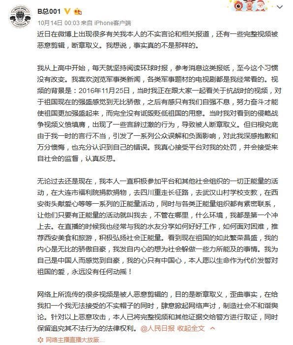 相信此前主播“莉哥”在直播时戏唱国歌,以及陈一发早年“口嗨”南京大屠杀被处罚一事大家都还记忆犹新,然而即使是在如此严厉的处罚之下,依然管不住那些喜欢“口嗨”的主播们,近日斗鱼一位名为“B总001”的主播在直播时再次因为不当言论被处罚。 据悉,在不久前此人在直播中居然声称:“从进化论的角度来说,中国人没有日韩进化得好;如果我是日本人,我也会选择侵略中国。” 说起“B总其人”原本是一位在斗鱼上比较有人气的主播,平时爱讲段子,喜欢“查房”女主播,给观众感觉则是个土豪人设。虽然他在此前的直播中时不时的就会爆出两句“国骂”,不过喜欢他的观众们也并不在意。但这次他的做法却引发了一片骂声,理直气壮支持日本侵华的言论也激怒了大量网友。 在被网友举报后,目前该主播的直播间已经被平台关闭。而人民日报则评论表示“斗鱼需‘斗愚’”,声称这样的奇谈怪论令人发指,故作深刻消费国仇家恨,而主播胆敢触碰高压线的原因还是因为平台管理不当。在评论的最后人民日报官博还表示:“强化公司及平台旗下主播的法律法规教育与社会责任感,别说说而已。” 在评论区中,有部分网友表示这次B总的视频是被“断章取义”,是被有心人故意抹黑的。不过网友们对这样的言论却并不买账,在评论区中有网友表示:“中国人进化得没有日韩好,这句话也是被剪辑的吗?” 但在该主播的个人微博中,他不仅大吐苦水,甚至还表示自己“一直积极参加平台和其他社会组织的一切正能量的活动”,还表示“网络上所流传的很多视频是被人恶意剪辑的,目的是断章取义,歪曲事实,在给我扣一个我无法接受的不实帽子的同时,肆意掀起网络声讨,制造社会不和谐舆论。” 不得不说,不管是出于怎样的原因,这种哗众取宠、以民族伤痛和屈辱历史取乐的行为都是不可取的。而且在视频中该主播多次表明自己崇尚希特勒,并且频频赞美日韩等民族。当然,我们并不否认其他国家优秀的传统和文化,但如果赞美他们的前提是践踏我们自己的民族尊严,这样的做法真的合适吗? 不知各位小伙伴对该主播的做法怎么看?欢迎说出你的意见! |