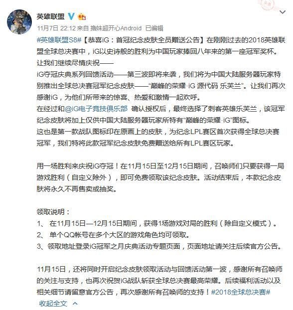 虽然今年iG战队代表LPL在S8全球总决赛中拿下了首个S赛冠军,不过在夺冠后官方的表现却有些冷然,与此前RNG在MSI上夺冠后的反应差距较大,因此也引起了不少iG粉丝和玩家们的不满。 在经历了此前被多番吐槽之后,昨晚《英雄联盟》官博发布了LPL首冠纪念皮肤全员赠送的公告: 根据公告表示,在冠军庆祝活动的第三波中,官方将会所有中国大陆服务器的玩家推出全球总决赛冠军纪念皮肤。在经过与iG战队协商并确认授权后,最终决定将诡术妖姬乐芙兰的新皮肤“源代码-乐芙兰”作为首冠专属纪念皮肤,并且会在这款纪念皮肤上加上中国大陆服务器所特有的“巅峰的荣耀·iG”图标。 据悉,这款皮肤将会是LOL首款将战队图标印在原画上的皮肤,谨以此纪念LPL赛区的首个S赛冠军! 想要获得这款皮肤的方式也很简单:只需要在11月15日到12月15日期间,在游戏中获得一场除自定义模式之外的胜利即可在后期公布的iG冠军之月庆典活动页面领取,即使是同一个QQ账号下的多个不同大区角色都可以领取。 值得一提的是,这款珍贵的皮肤只能在为期一个月的活动时间内通过胜利来获取,在活动结束后这款皮肤将不会再以售卖、抽奖等形式重新推出,或许将成为一款真正意义上的绝版。虽然说看上去只不过是在英雄皮肤上增加了一个战队LOGO,但这的确是首款将LOGO印在英雄皮肤上的举措,对于iG这个来之不易的冠军,这个皮肤也有显得意义非凡。 不过在官博下方,玩家们似乎对这样的补救措施依然不满意: 各位小伙伴认为官方这次的补救是否够诚意?如果不够,大家认为需要作出怎样的回馈才能令人满意?欢迎说出你的看法! |