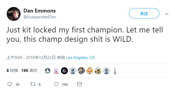 很早之前拳头设计师就透露过有两个新英雄正在设计中,其中一个是多彩绚烂的法师,另一个就是使用锁链的英雄。而前者正是不久前公布的万花通灵妮蔻,后者锁链英雄的技能设计也已经全部完成很有可能会在明年年初发布。 随着英雄联盟的发展,拳头扩充了设计师团队,目前也有设计师暗示有数个新英雄正在设计,以及一个旧的英雄正在重做中。那么可以大胆地猜测一下,拳头明年上半年的公布计划很有可能是双天使—锁链英雄—VGU—新英雄这个顺序。而近日拳头的设计师Dan Emmons就宣布了他他已完成了自己第一个英雄的技能组设计,还表示这个新英雄的设计非常“狂野”。 Dan Emmons在今年9月才加入拳头公司,是拳头游戏的新人,但他并不是一个新手设计师。Dan Emmons曾经担任了《万智牌》的设计师,后来加入暴雪游戏的Team5,负责了《炉石传说》的新卡初步设计,而他主要的工作是制作各种乱斗模式。Dan Emmons之前没有在MOBA游戏中从业的经验,英雄联盟是他参与的第一款MOBA游戏制作,而拳头游戏直接让他设计新英雄,也是看中了他天马行空的能力。 既然Dan Emmons以前是负责《炉石传说》新卡的设计,那么新英雄的设计很有可能也会参考到《炉石传说》里一些卡的技能。那么亡语战吼、风怒、圣盾、冲锋以及很有可能就会出现在新英雄的技能组里。 |
