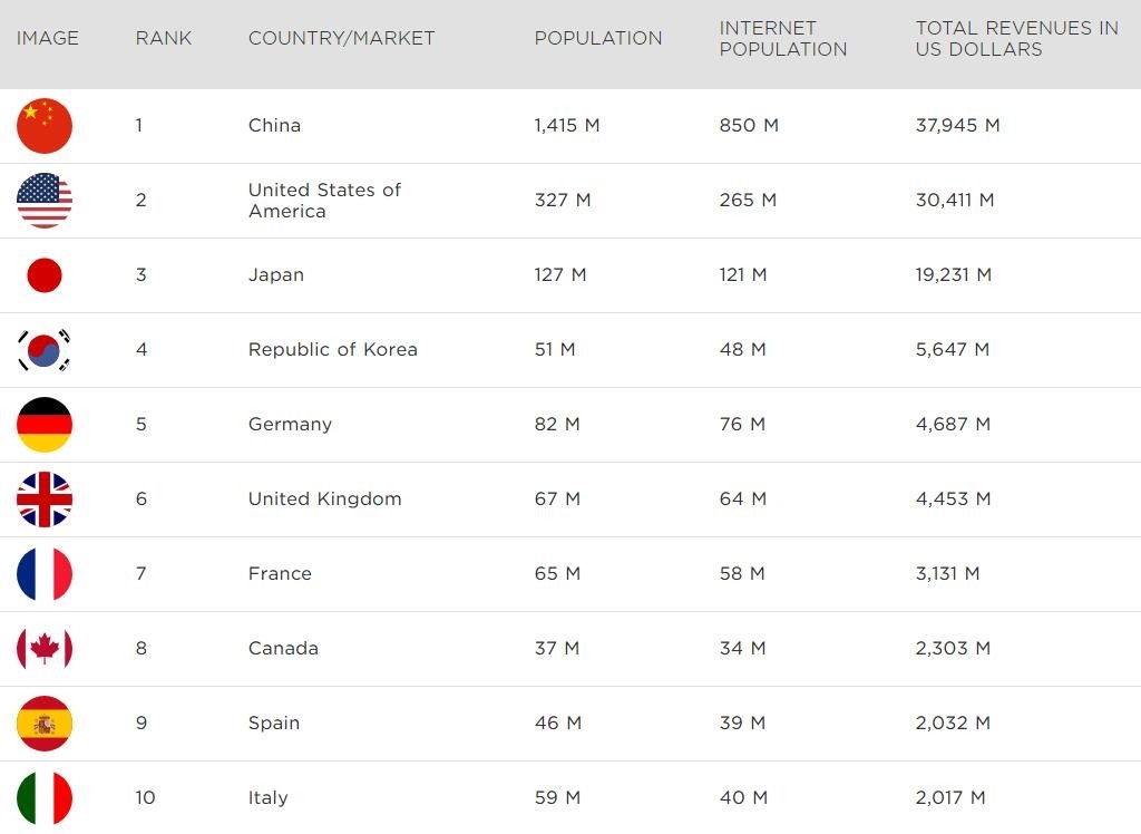 世界知名第三方游戏市场情报研究机构Newzoo近期发布了全球游戏市场统计数据,并列出了全球排名前100的市场榜单,而在这份榜单中,中国市场凭借379亿美元的市场额排名第一,排在之后的是304亿美元的美国和192亿美元的日本。 榜单中除了收入数据外,还列出了各国人数和网民数排行榜,中国凭借8.5亿的网民数量超过榜单中的其他国家非常远,也难怪那么多游戏厂商想要进入中国。 根据Newzoo介绍,这份榜单中的收入包含了主机、PC以及移动端等各个平台。 |