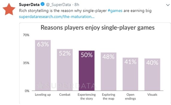数据统计机构Superdata今天发布了单机游戏受玩家欢迎的原因。丰富的故事是单机游戏吸引玩家的一个重要因素之一,占了玩家调查统计的50%。 其他关于玩家喜欢单机游戏的原因,画面占40%,开场和结尾41%,地图探索48%,战斗52%,升级63%。 SuperData分析师Courtney Sanders也讨论了为什么“丰富的故事”是游戏赚钱的关键因素。 从1990年代到2000年代,电视节目无论质量还是数量都涌出新高度,开启了电视机的黄金时代。像《双峰》,《广告狂人》,《绝命毒师》和《权力的游戏》等新剧继续为现代电视剧树立标签。 随着独立平台继续产出创意内容,不被网络规律左右,故事创作还将会继续进化。相似的是,游戏世界也在经历一个类似的转变,随着制作人,大开发商投入更多经费,加入更多资源到他们的游戏叙事上,开发商会制作更多多元化,且沉浸感很强的故事,而且是只能通过游戏交互传高效表达的故事。 事实上,独立游戏如《传说之下》近几年就讲述了颇具深度的故事。一些开发者组成的小团队,可以不用顾虑大发行商对主流市场的关心,一心试水故事内容。 而在巨头开发商里,游戏中的故事讲述也总是热议话题。一些3A游戏的叙事因为被放在“玩法机制”之下而被批评,故事才是游戏的真正的明星。然而,一些单机游戏玩家对游戏故事的喜爱和对玩法机制的喜爱一样,如战斗,探索和解决谜题。 由于对更好故事的需求,主流游戏也在剧情创作上有了更大的飞跃,制作人拥有更大的自由决定自己的创意。 砍杀以及一些射击游戏的主题如浪漫,性和家庭内容更被看重,而不是当做配菜,比较下《战神》(2005)和《战神4》(2018),这2款游戏都备受好评。第一部将玩家推到一个史诗级,令人叹服的世界,非常直接;主角奎托斯主要动机是狂怒。 《战神4》展示了一个更注重情感的故事,讲述父亲与儿子的亲情,同时保留前作畅爽,暴力玩法。顽皮狗系列《最后生还者》和《神秘海域》为玩家带来极高的电影化体验。 游戏剧情不必仿效电视作品的成功,他们可以量身制作专门适用于电子游戏的互动。《尼尔:机械纪元》的故事不一定适合作为电视剧或者电影。 为了获取游戏的前2个结局,玩家必须完成同样的战役2次。游戏的重复内容能行得通是因为游戏机制的不同导致。 游戏中的故事剧情才是故事驱动型游戏大赚的关键原因。在它们分别发售的月份里,《巫师3》赚了6900万美元,《神秘海域4》赚了5600万美元,《战神》数字版很快去得1.31亿美元收入。结果显示玩家对游戏故事有重大需求。 |