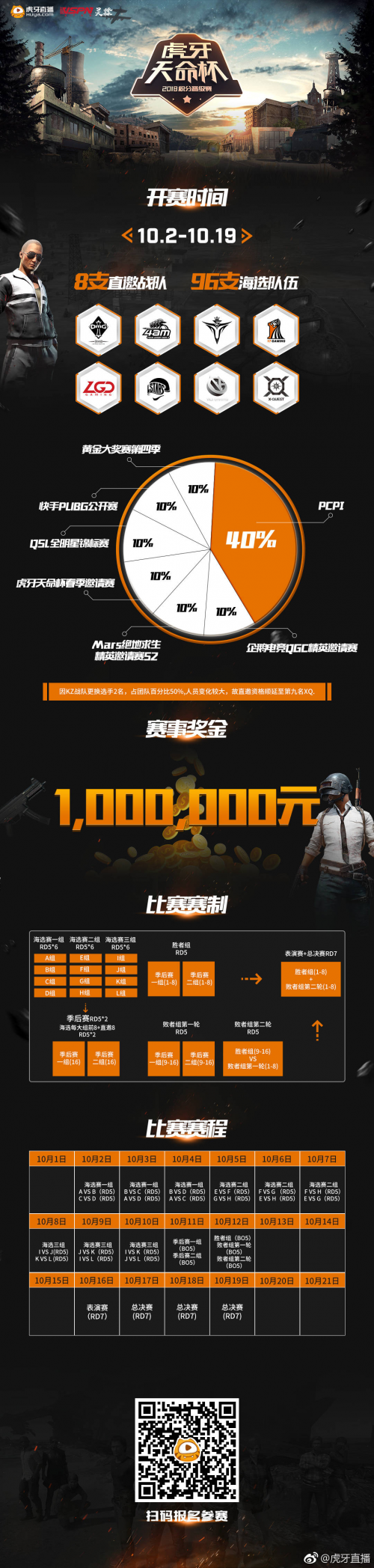 备受期待的虎牙天命杯“第二季”终于在9月8日正式官宣了,本届天命杯将继续由虎牙直播主办,并正式获得PUBG Corporation的官方授权,官方运营商VSPN也将参与赛事承办,虎牙天命杯正式成为战队晋级PCPI S2的积分赛段。 本届天命杯邀请到了国内最顶尖的104支绝地求生战队,并根据PCPI S1赛季、虎牙天命杯春季邀请赛、黄金大奖赛等7个大型赛事的成绩进行了积分排名,筛选出本届天命杯的8个种子选手即直邀战队,这八支直邀战队分别是OMG、4AM、V5、17、LGD、Lstars、VG、XQ。直邀战队将直接晋级季后赛,剩下的96支战队则需要从海选赛开始打起。 96支海选战队将分成12组划分在3个大组内,在10月2日~10日的预选赛中,3个大组将轮流进行为期三天的RD5循环赛。最终,三个大组积分前6的队伍将晋级季后赛,与8支直邀战队在季后赛中捉对厮杀。32支队伍在10月11日~12日的季后赛中,通过双败RD7赛制,决出总决赛的16支队伍,总决赛将在10月17日~19日举办,赛制为RD21。 本届天命杯2018积分晋级赛除了拥有高达百万的惊人奖金外,优胜者也将直接获得PCPI S2赛季的宝贵积分。作为PCPI正赛前的最后一场积分赛,这次比赛是所有积分还不理想战队的最后冲刺机会;而已经获得积分优势的战队,也将进行正赛前的最后调整。无论如何,天命杯都将吹响所有绝地求生战队的集结号,必然掀起新一轮的绝地岛风云。 作为国内直播平台的领头行业,虎牙直播响应国家号召,积极致力于电子竞技的发展和扶持,全力打造天命杯等正规职业电竞赛事。本届虎牙天命杯,除了全程的蓝光高清直播和优质的线下赛事硬件外,赛制规则也紧随国际赛事潮流进行更改,为中国战队出征世界赛做好预备工作。究竟本次比赛的精彩程度如何,请大家关注由虎牙主办的天命杯2018积分晋级赛吧。 |