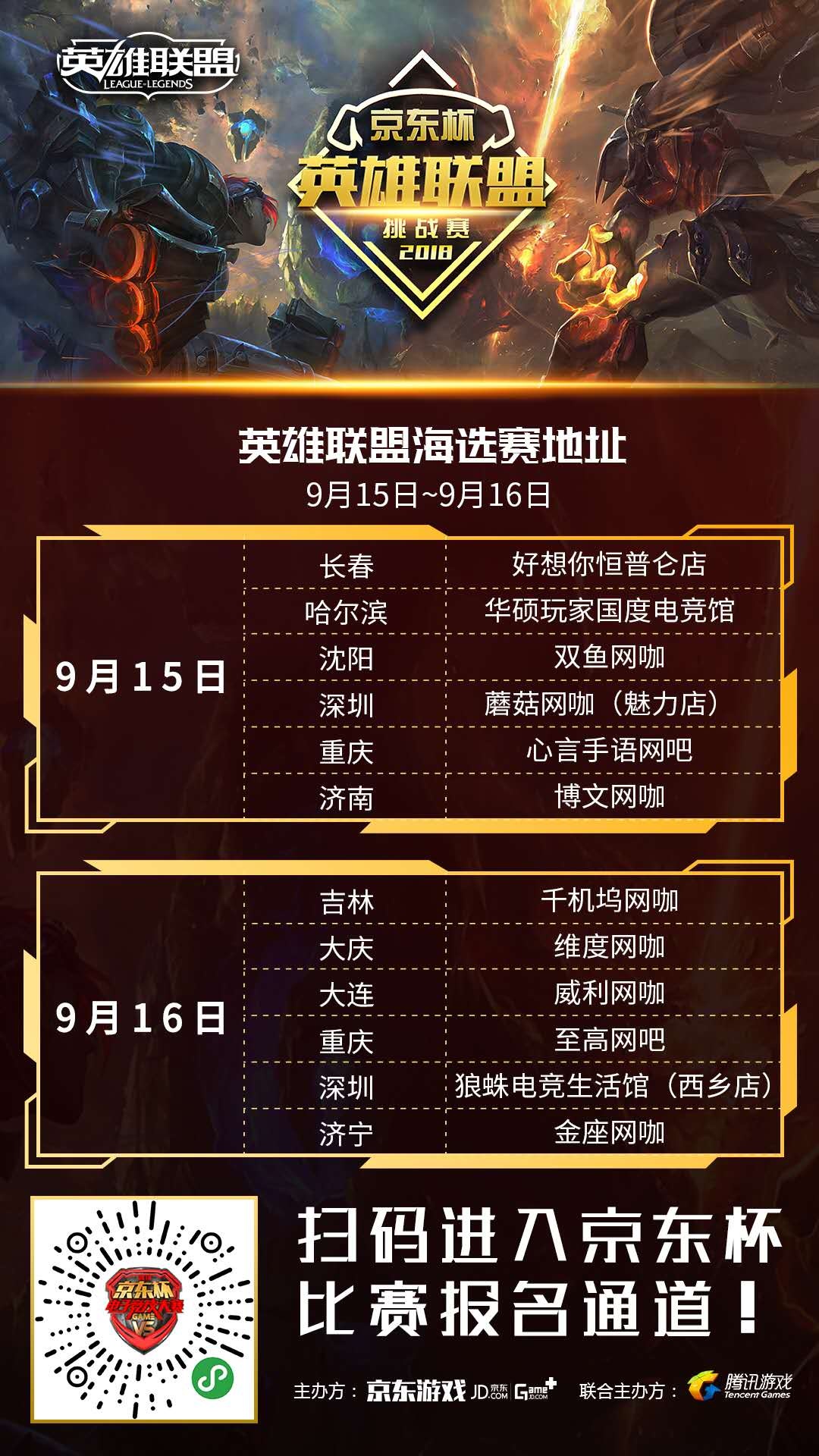 由京东游戏和腾讯游戏联合举办的2018京东杯电子竞技大赛S2于8月27日正式启动报名以来,掀起了各大游戏玩家的竞赛热情。始于2015年的京东品牌赛事,目前已经到了第四个年头,本届京东杯电子竞技大赛S2包含英雄联盟和绝地求生两个比赛项目,其中《英雄联盟》奖金池高达60万,《绝地求生》奖金池高达100万!报名正在火热进行中,截止到目前,已有数百只队伍争相报名。 9月15日海选开战 十二城先燃战火 京东杯电子竞技大赛英雄联盟城市海选赛在千万玩家的期待中,将于9月15日-9月16日率先吹响这场全民竞技盛典的号角。来自深圳,长春,重庆,济南,沈阳,吉林,大连等12座城市的各路民间高手,将在这个周末正式展开激烈的角逐与厮杀。以下为首批海选赛参赛城市: 9月15日 第一场:长春 哈尔滨 沈阳 深圳 重庆 济南 9月16日 第二场:吉林 大庆 大连 重庆 深圳 济宁 有关于本届赛事的详细信息,还可登录新浪微博关注“京东游戏娱乐”,参与微博话题互动#京东杯电子竞技大赛##开撸开黑,带你飞#赢取各种豪礼!?? ?? 具体参赛网吧地址请微信扫描图中小程序码,查看具体事宜。 百城玩家集结 群雄亟待一战 由京东游戏和腾讯游戏联合举办的2018京东杯电子竞技大赛S2于8月27日正式启动报名。本届京东杯S2《英雄联盟》项目共覆盖八大赛区,二十四省,可谓全国年度最大的非职业电竞赛事。盛况空前的全民电竞舞台,还未开始就已经勾起了所有人的心。自报名开启后,无数抱有实力与热爱的玩家,纷纷参与报名。短时间内迅速集结了数百支来自全国各地的民间队伍。他们将在未来的两个月里,踏上冲击冠军的征程。如果你渴望舞台与荣誉,如果你天赋出众实力强劲,就千万不要错过本次京东杯电子竞技大赛的舞台,带上你的队友,向着总决赛的舞台和高额的赛事奖金发起冲击吧!扫描下方二维码,与你的小伙伴一起参与这场年度最大的全民电竞狂欢。来报名吧,来开始这场盛大的典礼!2018京东杯电子竞技大赛 英雄联盟挑战赛已经开启! 百万赛事奖金 送给热爱电竞的你 更大的舞台,象征着更大的荣誉。上半年京东杯S1的高额赛事奖金激起了无数参赛者的热情。而京东电子竞技更是为京东杯S2加大投入,本届S2总奖金池高达160万元!《英雄联盟》奖金池达到60万元!PUBG邀请赛奖金池高达100万!获得京东杯英雄联盟总冠军的队伍,将获得15万元的冠军奖金!而自海选赛开始,胜利的战队即可获得阶段性奖金奖励。每一场酣畅淋漓的胜利,京东杯S2都为你准备了高额的奖金回报!热爱电竞的你,绝对不容错过! |