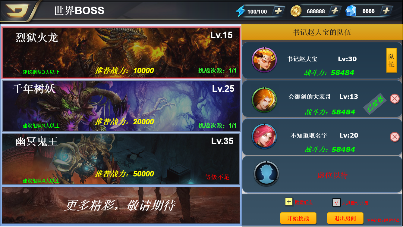 近日,《虚空风暴》开发商罗城顶联游戏公开了《虚空风暴》手游更新相关内容。其中包括,多人交互性玩法更为丰富,预计新增““世界BOSS”和“十二星宫”等内容。 1.世界BOSS “世界BOSS”考验的是玩家之间的默契配合,通过不同的技能释放搭配,协力击杀世界BOSS获得最终奖励。据开发者介绍,世界BOSS的乐趣在英雄的搭配,通过操作和辅助技能的释放躲避BOSS伤害,获取最大输出,增进玩家之间的互动。 世界BOSS组队挑战 世界BOSS模拟战役图 2.“十二星宫” 据开发者介绍,“十二星宫”是需要玩家处于组队中进行爬塔挑战的一项交互性玩法系统。玩家通过爬塔探险不仅能获得宝物,还能遭遇强大的敌人,体验刺激的战斗。 全新“十二星宫”模拟图 3.“星语星愿” “星语星愿”主要是通过增加普通和高级奖池的方式,增加装备和碎片获取的一种玩法。 “星语星愿”模拟图 【游戏特点】 -多英雄协力通关副本玩法 为手游用户打造特色系统,摆脱一个角色的单调玩法 -极致3D画面,炫酷视觉效果 Unity3D引擎全力打造,精致的画面和光影特效。? |