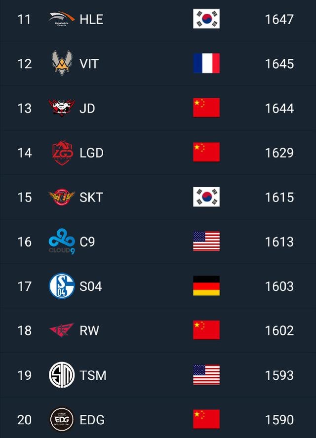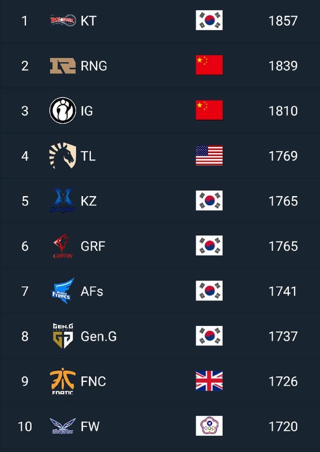英雄联盟最新战队排行榜:RNG从第11名飞升至第2名