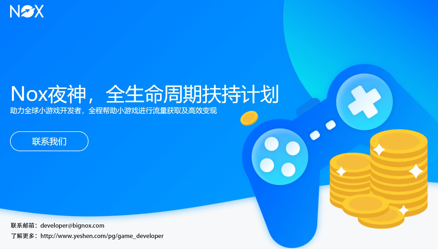 近期,小游戏产品单款爆量屡现,成为行业新的开发热点,吸引众多开发者和厂商涉足。而与此同时,其产品推广、变现、生命周期短暂等难题再次浮出水面,如何长久吸引用户、将现有流量变现,成为很多开发者需要破解的难题。 全球领先的智能分发平台——Nox(夜神)深耕行业数年,十分重视对开发者的扶持,致力于赋能开发者,降低开发者的推广成本并提高变现效率。本次特别针对开发者面临的推广、变现难题进行定向帮扶。在全球范围内寻找志同道合(潜心游戏行业,以为玩家带来快乐为本心,追求极致,并为此不懈努力、不断坚持的开发团队或个人),为其提供资金、推广经验、变现方案等全方面服务,共同推动行业成长。 该项计划主要面向拥有移动独立游戏作品的开发者团队或个人,凡报名参与并达成合作的开发者都将获得Nox(夜神)在产品成长体系、运营推广体系、流量变现体系等方面的全力支持。具体权益如下: 产品成长体系:提供产品优化深度解决方案,基于游戏玩法、美术、运营策略等进行专业而深度的指导支持,增强产品竞争力。 运营推广体系:多轮推广费用支持及效果保障,每轮最高万元美金推广费用,最高效的推广方式,百万级曝光效果; 流量收益体系:定制全程变现解决方案,专业变现人员针对变现周期、效能等提供一对一指导,基于高LTV基础,实现变现最大化; 其中,确认合作的作品,Nox会基于产品属性(类型、玩法、美术风格等),进行数据(类似游戏用户画像、喜好等)分析,制定符合其成长的产品再次优化方案,提升产品的市场价值。同时,确认合作的产品还可以获得Nox资金支持,并且会根据产品的不同生命周期给予不同额度的支持,另外,Nox也会通过旗下的NoxInfluencer(网红自媒体数据平台)、NoxMobi(在线智能推荐引擎)、全球流量体系(NoxPlayer、NoxCleaner、NoxApp+自有产品)赋能确认合作的游戏,帮助其实现高效的用户获取。而在流量变现方面,Nox也会基于其在产品变现领域的多年经验,将用户体验与变现方案有效统一,合理而最大化的变现。 Nox(夜神)希望通过此项计划,在除了能够帮助开发者获得成长收益,创造卓越的产品之外,也能一起探索出,用户习惯培养、变现之道,让产品更具价值和产业光辉,推动行业的整体性进步。 最后,附该项计划具体的合作条件和方式,有意向的开发者可直接与Nox(夜神)开发者扶持项目组联系。 【合作条件】: 符合相关法律法规的游戏作品的,不得涉及任何非法或剽窃侵权行为; 合作作品以小游戏为主,休闲、街机、益智、解密、冒险等; 已经上线或即将上线的游戏作品; 满足Nox(夜神)内部游戏审核评级制度,审核指标为游戏玩法、风格、质量、安全等。 【联系方式】: 邮箱:developer@bignox.com 邮箱内容:注明公司/工作室名称、联系人姓名、联系方式(电话、微信等)、有意向接入产品名称及上线应用商店链接或安装包。 【了解更多】 http://www.yeshen.com/pg/game_developer |