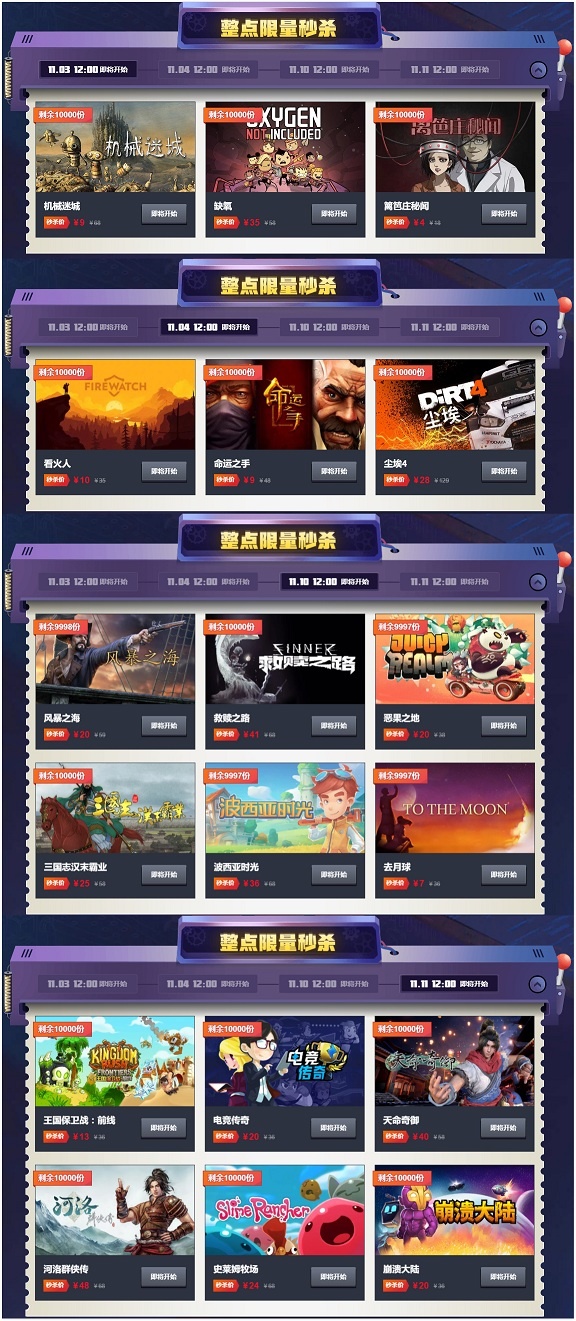 踏入11月,属于千万玩家的专属购物节——WeGame机友节终于跟大家见面了!11月1日-11日,“寻找WeGame游戏锦鲤”活动依然火热进行中,口令红包六大游戏媒体和三大直播平台为口令红包加码,大额神券和Q币奖励等你来拿。更有12款热门游戏迎来史上最低价、周末限量秒杀、百万回馈Q币,誓把为玩家谋福利的精神贯彻到底!想知道这个机友节怎么玩、哪些优惠不可错过,赶紧拿着小本本记下来吧! 限量秒杀嗨翻周末 双十一的奥义,不就是以最优价格实现最愉快的买买买么?在机友节大促期间游戏定价上,WeGame可谓是诚意十足。11月3-4日、10-11日这两个周末,每天中午12:00将开放多款游戏秒杀,秒杀价格比过往活动价格更低,每款游戏限量10000份。各位玩家,展现你们神手速的时候到了! 百万Q币大回馈,送给喜欢游戏的你 活动期间通过点击页面上的宝箱按钮可以进入“百万Q币大放送”的环节, 宝箱领取的正确姿势:买游戏→领QB→买游戏→领QB→买游戏→领QB 只要活动期间购买游戏并玩满2小时就可以打开宝箱领取Q币!最高可获得1000Q币的机友大回馈哦! 10款历史低价诚意满满! 没能抢到秒杀的朋友也不用丧气,还有10款人气游戏史低价来袭。还原每个人青春历程的扎心模拟养成类游戏——《中国式家长》原价36元,活动期间到手价仅20元;清新自然的模拟经营游戏《星露谷物语》达到史低价23元;深海主题沙盒建造游戏《深海迷航》低至20元……如果你对这些游戏心仪多时了,赶紧趁着史无前例超低价速速将它们拿下吧! 游戏合辑折扣加码 篝火营地、二柄、机核网、游民星空、游戏时光、游研社等六家游戏媒体,以及斗鱼直播、虎牙直播和企鹅电竞三大直播平台,都精心挑选了数款游戏并以合辑形式推荐给大家。合辑价格都在原价五折以下,部分甚至达到三折以下。除了简单粗暴地直接打折,上述游戏媒体和直播平台还提供专属折扣优惠券,让优惠加码更享折上折! 除了游戏媒体和直播平台的推荐合辑,WeGame也为各位玩家准备了RPG、动作、策略、硬核和沙盒五大类型游戏合辑,囊括该类型下多款佳作,以超实惠合辑价让你一次下手、玩个痛快! 免费试玩惊喜多多 相信很多人都有过这样的经历:不确定一款游戏是不是合自己胃口,入手时总要左思右想。针对这个问题,WeGame在此次机友节贴心推出免费试玩福利,涵盖《欢乐兄弟》、《进击!要塞!》、《围攻》、《红石遗迹》等多款热门游戏。值不值得买,尝鲜一把就知道了! 此外还有多款游戏正以诱人低价等你领走体验。近日新鲜出炉的国产多人联机乱斗游戏《欢乐兄弟》仅需20元;河洛工作室最新力作《河洛群侠传》以68元的价格火热销售中;《最终幻想14》更是作为首充福利大放送提供免费下载。 两大经典角色扮演游戏系列——《古剑奇谭》系列和《仙剑奇侠传》系列均有超优折扣,分别低至原价四折和九折优惠。 爽快战斗类游戏中,画面精致操作硬核的《救赎之路》仅需58元;国产精品独立游戏《艾希》则达史低价22元;古怪动作冒险游戏《崩溃大陆》仅售28元。 更有诠释唯美爱情故事的独立游戏《去月球》、斩获视觉艺术大奖的冒险游戏《机械迷城》、画风绝美的探险解谜游戏《银河历险记3》等游戏佳作,都能以超优价格抱回家! WeGame机友节活动之多、价格之低、福利之大,你心动了吗?不如赶紧行动,带上你的好“机友”,开启玩家专属的购物大狂欢吧!以上就是手游巴士为您提供《WeGame机友节隆重开幕,近百款游戏大促不可错过!》的详细内容,更多精彩内容请继续阅读上一篇《兄弟:双子传说手游笑傲移动端的独立游戏江湖》 |