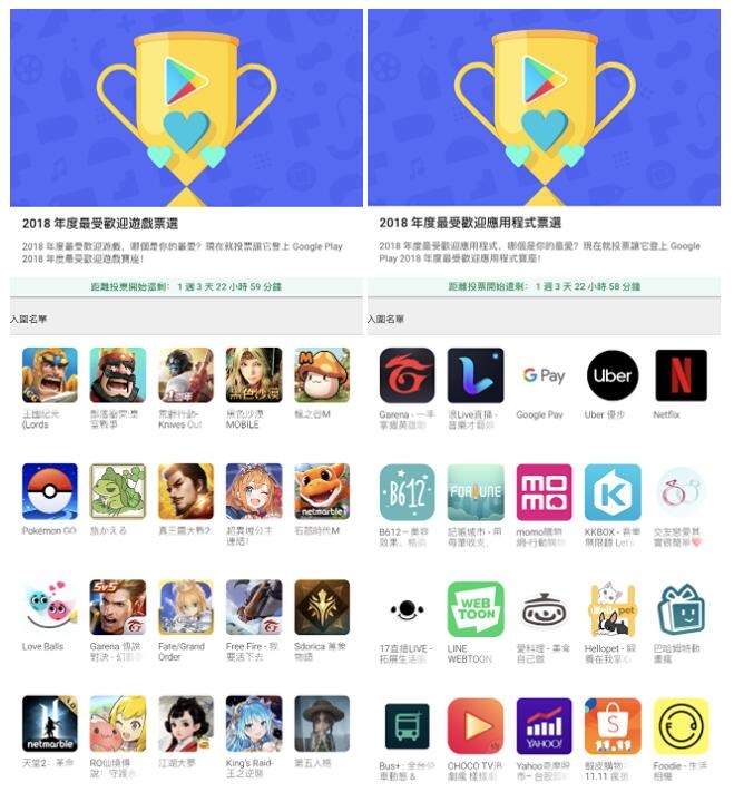 随着 2018 年已经进入尾声,Google 每年 12 月皆会公布“Google Play 年度最佳榜单”,分享一整年在 Google Play 上最佳的应用程式、游戏、电影和书籍等内容。而今年的中国台湾省地区的Google Play 2018年度最佳榜单,首次新增“2018 年度最受欢迎游戏”与“2018 年度最受欢迎应用程式”两个奖项,玩家将能到Google Play 上投票选出最喜爱的应用程式和游戏,一起参与Google Play 的年末盛事。 Google Play 2018 年度最受欢迎游戏与应用程式票选页面 . “2018 年度最受欢迎游戏”名单 《Fate/Grand Order》 《Garena 传说对决》 《天堂 2:革命》 《王国纪元》 《超异域公主连结☆Re:Dive》 《Free Fire - 我要活下去》 《枫之谷 M》 《部落冲突:皇室战争》 《青蛙旅行(旅かえる)》 《荒野行动》 《江湖大梦》 《真三国大战 2》 《 黑色沙漠 MOBILE》 《石器时代 M》 《King’s Raid – 王之逆袭》 《第五人格》 《Love Balls》 《RO 仙境传说:守护永恒的爱》 《Sdorica 万象物语》 《Pokemon GO》 Google Play 于近日公布“2018 年度最受欢迎游戏”和“2018 年度最受欢迎应用程式”各20款入围名单,票选活动将于2018年11月12日至2018年11月26日举行,而得奖名单将于2018年12月3日公布。官方表示,在活动期间使用者只要登入Google Play并前往票选活动页面,即可获得两个奖项各一票的票选资格。 “2018 年度最受欢迎游戏”投票页面>> “2018 年度最受欢迎应用程式”投票页面>> |