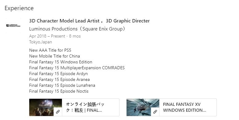根据史克威尔艾尼克斯Luminous Production工作室的一位开发者透露,SE目前正在“为PS5主机开发3A级新作”。这也是在史克威尔艾尼克斯旗下国外开发商Crystal Dynamics和Crystal Dynamics先后曝出正在为PS5和新Xbox开发游戏的消息之后,其日本本部首次跟次世代主机游戏扯上关系。 消息来自Luminous Production工作室首席3D角色模型设计师Tomohiro Tokoro的领英页面,他之前曾参与过《最终幻想:零式HD》和《最终幻想15》的开发工作。该工作室最近在田畑端出走之后将计划中的《最终幻想15》四款DLC砍为一款,因此这个页面中展示的并不像之前猜测的是《最终幻想》相关项目,而至少会是次世代主机的新作。 该工作室负责人兼COO田畑端最近已从史克威尔艾尼克斯离职,与此同时,厂商方面的公告中还表示Luminous Production将会专注于“大规模高品质的3A大作”开发,不知接下来我们将要看到的是哪款作品,很有可能是田畑端在离开工作室之前参与开发过的一个项目。 从同一个页面中可以看到,Luminous Production目前还正在面向中国市场开发一款手游,具体消息也没有公布。 |