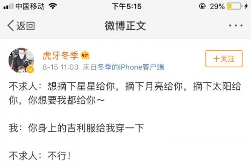 听说满嘴甜言蜜语的人,一般都不是什么好人,可即便如此,当有人说甜言蜜语给你听时,你还是会暗自开心。不过小编发现,现在的年轻人已经不流行说一些文艺小清新类型的情话了,而是满嘴的“土味情话”。所谓的土味情话,就是很肉麻又充满乡土感觉的情话,与甜言蜜语一样非常的撩人。作为虎牙刺激战场“一姐”的冬季,就是一位特别擅长说土味情话的主播,他不但要说给粉丝听,还要说给“一哥”不求人听。 冬季土味情话的“鼎盛时期”,应该就是在今年9月份的时候。小编仔细数了一下,冬季在9月份时共发表了5段关于土味情话的视频,每天边吃鸡边教大家该怎样撩妹和撩汉。原本以为,冬季会在视频里找一个人妹子与他搭戏,无奈冬季的异性缘实在不咋地,只能一人分饰两角,既要扮演男方又要扮演女方,演了一场又一场“年度大戏”。每当冬季所扮演的男方说出土味情话时,冬季所扮演的女方都会笑眯眯的捂住嘴,演出一脸娇羞的模样样,一眼看上去还真的有一种少女感扑面而来,不过也有网友表示,捂嘴时的冬季像极了小岳岳。 虽然冬季讲的土味情话很有趣,但总觉得还是缺了些什么,小编左思右想,终于想出了答案,那就是缺了虎牙一哥不求人!冬季与不求人是一对基情四射的“好基友”,他们经常在微博里和直播间里有着各种亲密的互动,尤其是在微博上,冬季每隔一段时间都会撩不求人一下,还给他起了一个名为“小求求”的爱称。10月中,冬季与不求人更是模仿赵丽颖与冯绍峰的官宣体,大方示爱,简直是羡煞旁人。 表白有着接受和拒绝的两种可能性,而土味情话也有说出去后“翻车”的可能,就像不求人愿意摘星星摘月亮给冬季,却不愿意把吉利服给他穿一下,看来在游戏面前,什么兄弟情义,什么白头到老,都会化为乌有! 当冬季查房发现不求人在与汪苏泷一起开黑时,立马心生醋意,他在微博里发了一段不求人与汪苏泷开黑的视频,并说道:“小求求,我想听你唱泷哥的《有点甜》。”不知道“爬墙”泷哥的不求人会不会满足冬季这个条件呢?小编也很是期待不求人展现下自己的歌喉呢! 众所周知,冬季的直播风格一直以来都十分搞笑,所以大家也自然会觉得,他的性格比较耿直,可能不太擅长说情话。可看完了冬季的土味情话视频,以及和不求人的甜蜜互动以后,小编突然觉得,冬季是一个“情场高手”,不知道以后是哪位幸运的妹子会被“情话王”冬季撩到手呢! |