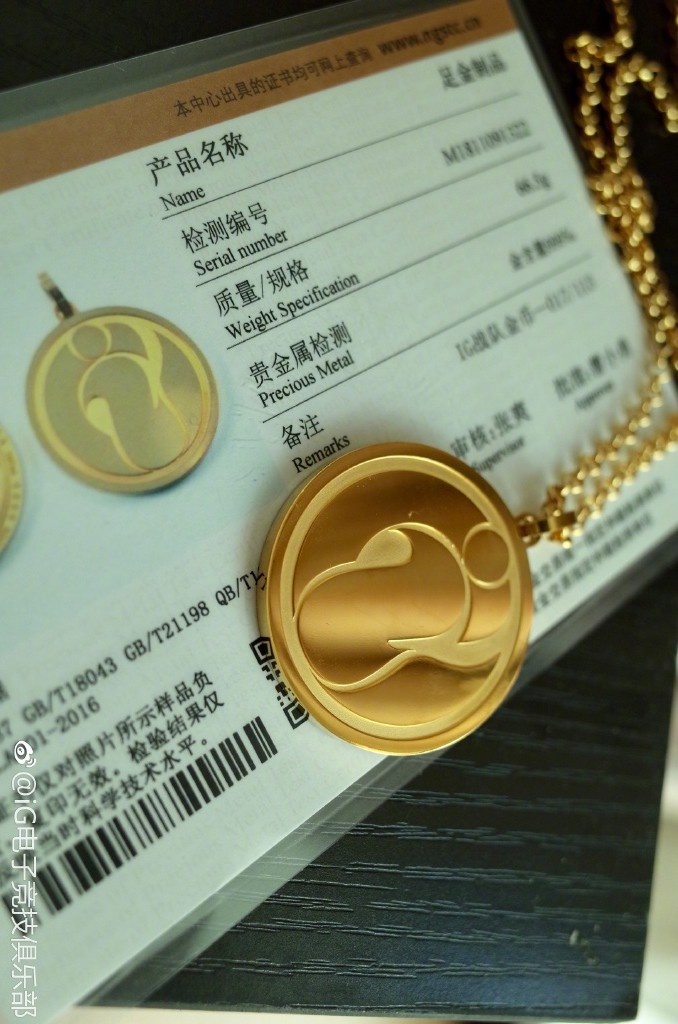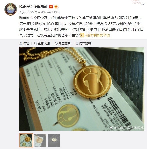 《英雄联盟》德玛西亚杯西安站昨晚正式落下了帷幕,iG战队以3:1的成绩战胜TOP战队,顺利拿下德杯西安站的冠军。@iG电子竞技俱乐部官博今天下午宣布随着iG战队德杯夺冠,迎来了校长的第三波福利抽奖活动。 随着昨晚德杯夺冠,我们也迎来了校长的第三波福利抽奖活动!根据校长指示,第三波福利改为在iG官博抽出。校长将送出20枚为纪念iG S8夺冠制作的纯金狗牌!关注我们,转发此微博并AT一位好友即可参与!“我从口袋拿出狗牌,哈了口气,然而…这块纯金狗牌再也不会生锈”。 iG狗牌一面是战队队徽,另一面则是参加了S8全球总决赛的六名队员,而且是纯金狗牌不会生锈,如果大家足够细心,就会发现检验人是张学友!“歌神”都出面站台了,看来这块金牌应该是纯金了。 |