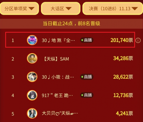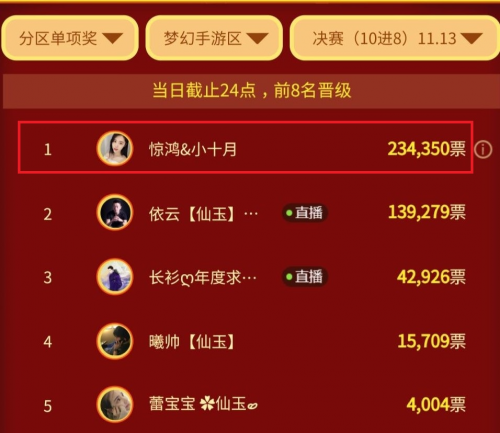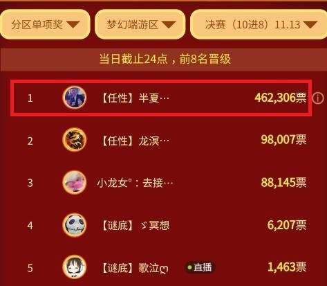 今天,分区决赛正式打响!10强主播摩拳擦掌,大战一触即发! 开战首日,其他主播还没开始发力,半夏就以雷霆万钧之势狂拉46w票登上榜首,远甩第二名36w票,并率先突破了100万的里程碑!成为年度第一个抱走万元奖金的主播!可喜可贺! 进入最后3天,年度最佳梦幻端游主播的头衔还是沉甸甸的,梦幻界主播的一次顶级PK!90096入围主播最多,差点霸榜的趋势!看来对这个奖项是志在必得呀! 这么骄傲的留影再来一次吧?我看可以~ 大话区的主播进入决赛后,终于开始不走钢丝线了。30的地煞一个早上就拉了20w票,稳坐榜首之位,来势汹汹! 梦幻手游区的黑马小十月,目前依旧以23w票位居榜首,面对依云、曦帅这些老主播也毫不畏惧!年度开始以来,这位主播一直都很努力,每个赛段基本都稳占榜首。 但是!姜还是老的辣,曦帅、依云等9998仙玉的主播可是年度老将,征战沙场的经验不少,最后能否给予反手一击,仍是未知数。 |