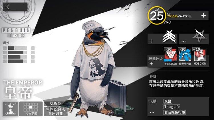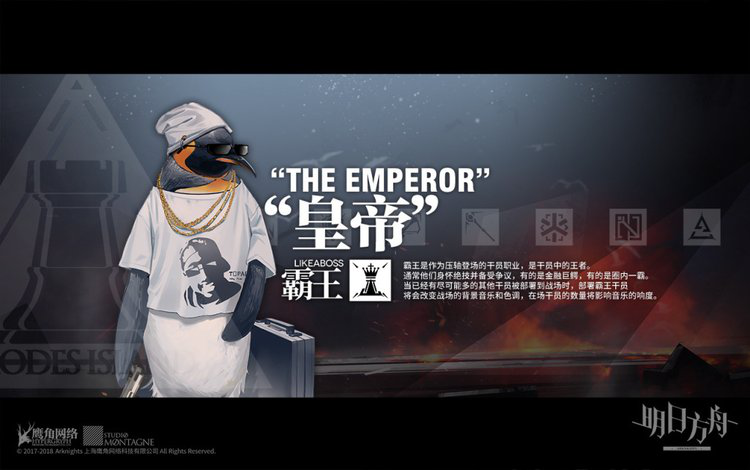 Put your f□□king hands up ——皇帝 皇帝在游戏中并非是玩家可以获得的角色,而是和魏彦吾、文月一样属于活在背景故事里的鹅物。但官方依然玩笑式地给皇帝设计了一套技能以及专属的职业。 皇帝的干员类型为[ 霸王干员 ]——听起来真的是非常牛逼,但是这个职业描述却是“改变战场上的背景音乐”这种对作战没有任何帮助的能力。除此之外[ 霸王干员 ]的图标也是细节之一,这个标志是西洋棋中的“国王”。在西洋棋中“King”这个棋子的战斗力仅仅比兵升变之前的士兵(Pawn)强了一点点。当然,上述的这都不是皇帝需要解决的问题。因为这位[ 企鹅物流 ]的最终boss甚至没有亲临战场的必要。 它只需要做好老板的工作,并注意不要让红酒洒出杯子就可以了。 虽然是皇帝的霸王干员身份只是用玩梗的方式设计出来的,但鹰角还是给皇帝设计了一整套技能——当然技能的内容也全是玩梗,比如皇帝的一技能的技能描述肯定会让不少炉石传说或者影之诗的玩家产生既视感,但“哥伦比亚之恋”实际上是一部电影;而皇帝的三技能图标则和“游戏王”的卡面结构基本一致。 皇帝的角色设定看起来有很浓厚的匪帮说唱歌手气息,实际上也确实如此,不管是手枪、大金链子还是满地钞票都指向了皇帝的天赋“Thug life”。关于这个词,你经常可以在snoop dogg、2Pac这些美国著名的说唱歌手的MV里和某个不存在的视频网站上甚至是网上流传的一些沙雕表情包看到“Thug life”的字样,不过由于这个词汇本身的敏感性,这里就不做过多的介绍了。 皇帝虽然只是一个游戏中NPC般的角色,但是从它看起来不太正经却细节多到溢出的角色设定里也能设计师这只企鹅的重视,就让我们一起期待游戏中“皇帝”必将浓墨重彩的首秀吧。 以上就是《明日方舟》霸王干员皇帝的介绍。 |