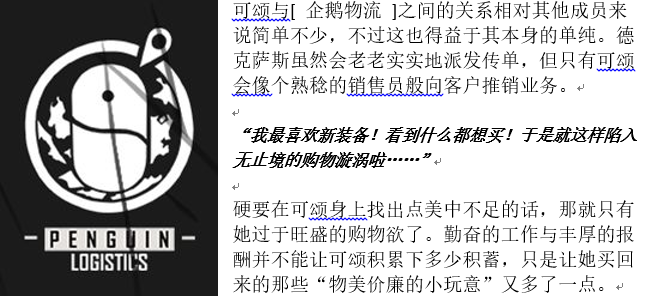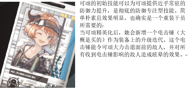 嘿,我敢说您的眼光真的不错,因为您现在得到了一个安全可靠刀枪不入的优质队友,而且佣金八折优惠哦! ——可颂 在[ 企鹅物流 ],找一个强大可靠的送货员从来都不是什么难事,但你如果要找一个正常的送货员,那就非得可颂在场不可。 可颂出身于哥伦比亚的丰蹄族,天生的强健体魄与使不完的力气令她足以胜任重装干员的所有工作。 可颂在游戏中的稀有度不算高,但是技能和天赋都属于非常实用的类型,不管面对什么样的敌人都有着相对不错的生存能力。不过由于电击锤和防御力提升技能只能二选一,在配置可颂进场之前一定要充分考量。 以上就是《明日方舟》重装干员可颂的介绍。 |