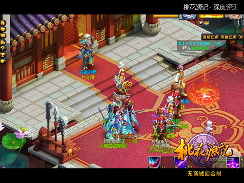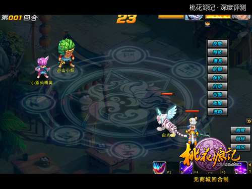 二、角色设定 角色设定,包含主角/职业设定、功能NPC设定、宠物设定、怪物设定等多个方面。 1,主角/职业设定 《桃花源记》在玩家角色的设定上,走的还是传统2D回合制的经典套路,也即人物造型与职业/门派不挂钩,玩家在一定阶段开始选择职业。 不过,在职业设定上,《桃花源记》却采用了偏ARPG的路数,最初门派划分仅为3个(昆仑、轩辕、逍遥),而后经过转职,扩展为6个(道士、贤士、战士、侠士、术士、隐士),再经过二次转职扩充为12个(道法、天师、祭师、天君、战魂、刃魂、豪侠、武圣、幻术师、阴阳师、药师、召唤师)。 这种在回合制里并不算太多见(虽也有先例,但采用者极少)的职业体系,让玩家经过一段时间的体验,逐步了解自身门派特点后再选择细分的职业分支,较为人性化,也提供了一个很好的职业成长阶段性目标。 但与此同时,12个职业并存的庞大体系,既要做到特点鲜明,又要做好职业平衡,难度着实不小,即便强如暴雪,也在职业数量超过9个以后出现了职业间逐渐趋同的不利局面。当然,就目前来看,《桃花源记》12职业间的差异化还是相当显著的,至于平衡性,由于涉及各职业的上手难度和不同阶段下的不同情况,难以简单评述优劣,只能说现阶段来看,在多职业的回合制游戏里做得已经不错。 三、视听效果 《桃花源记》采用五头身的半Q版写实画风,整体风格上较为接近《大话西游2》,甚至在UI和字体等方面也较为相近,但不论是画面分辨率还是人物着装、场景、宠物造型上,都有着显著的提高。 从游戏实际表现来看,目测《桃花源记》使用的应该是国产引擎,在画面刷新和运行效率方面较为成熟,运行时所耗系统资源极少,并且1080P的高清画面也如官方宣传的那样清晰自然。 至于音乐和音效方面,则与市面上的其他2D回合制游戏相比没有特别明显的优势,但也没有任何敷衍了事的粗糙成分。从登陆界面,到地图场景,再到战斗场景,每一个环节都拥有独立的背景音乐,其播放和切换也十分自然,在没有花费巨资去进行大规模的音乐及周边创作的情况下,这样的声音表现已经足够满足玩家需求。并且非战斗场景下的曲风也极具古典韵味,质量堪称上乘。