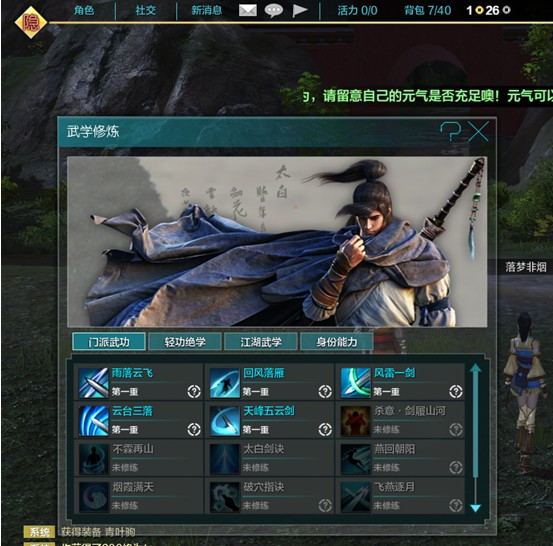 天涯总的有7个轻功技能跳跃:按下空格键可以跳跃,连续多次按下可让角色多段跳。最多支持三段跳。