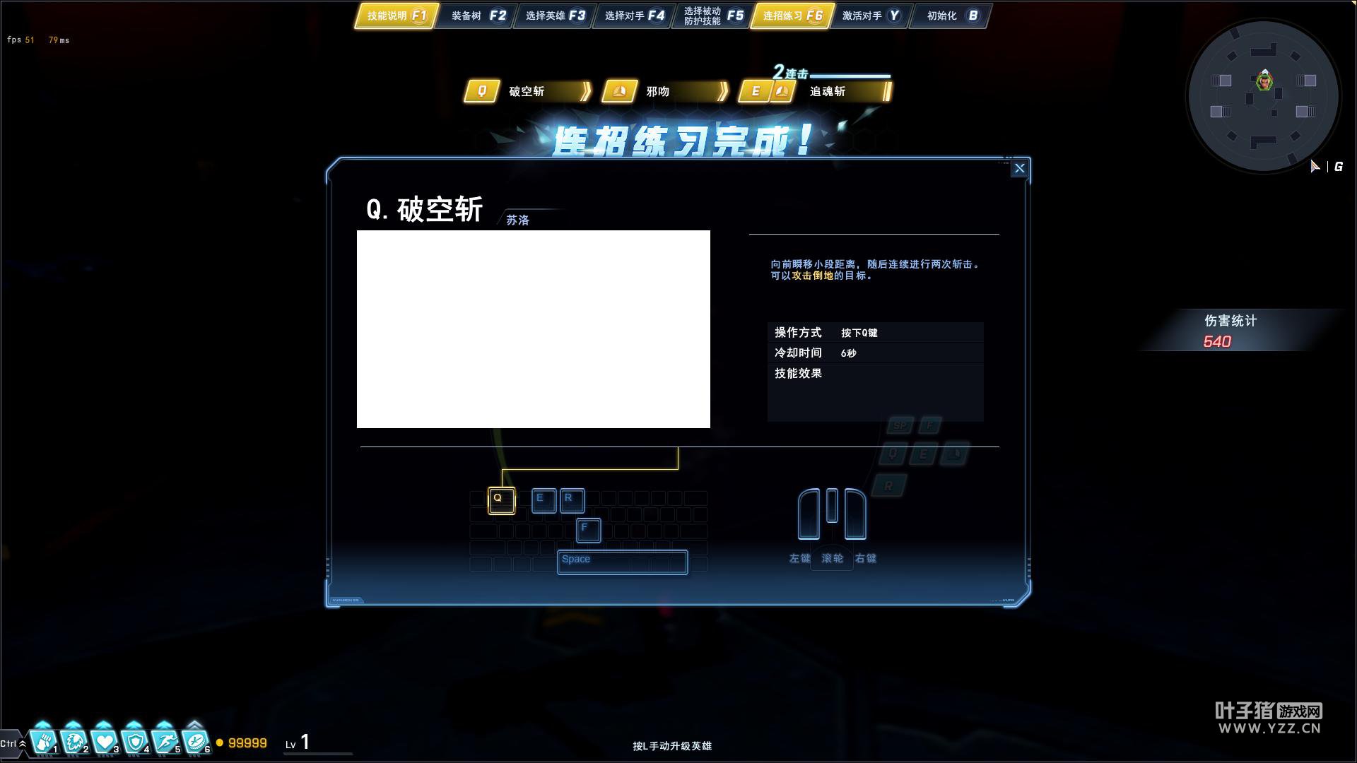 在《无尽战区》中玩家不在是靠鼠标移动,而是利用TPS的WASD键,空格、F、Q、E、R、鼠标左右和中键用来释放技能。在练习模式中按F1键可以查看技能说明。