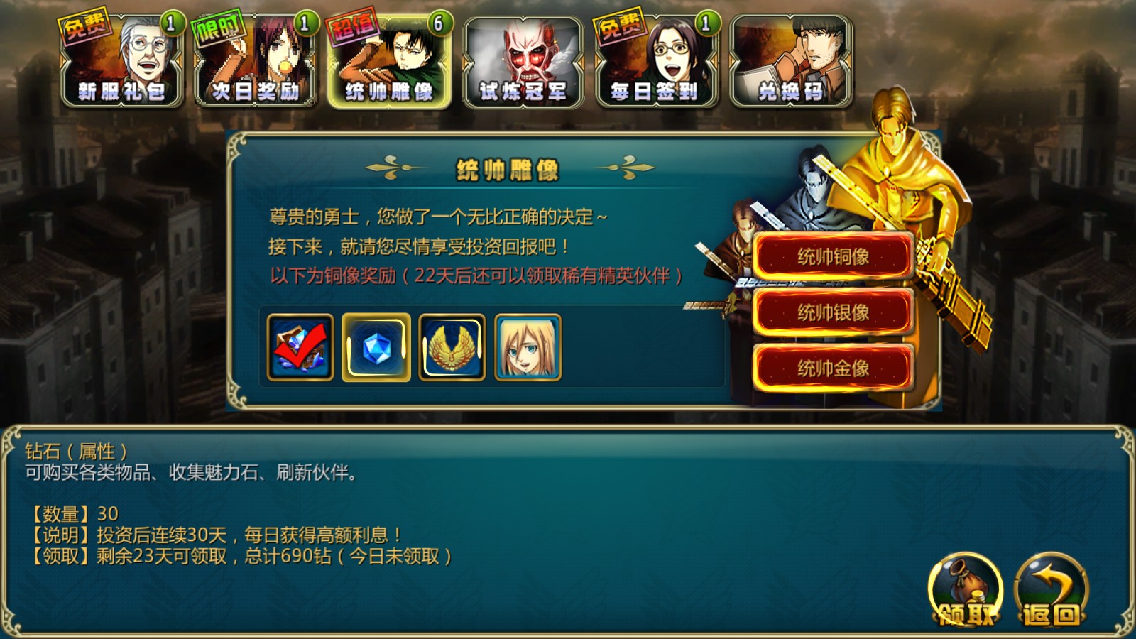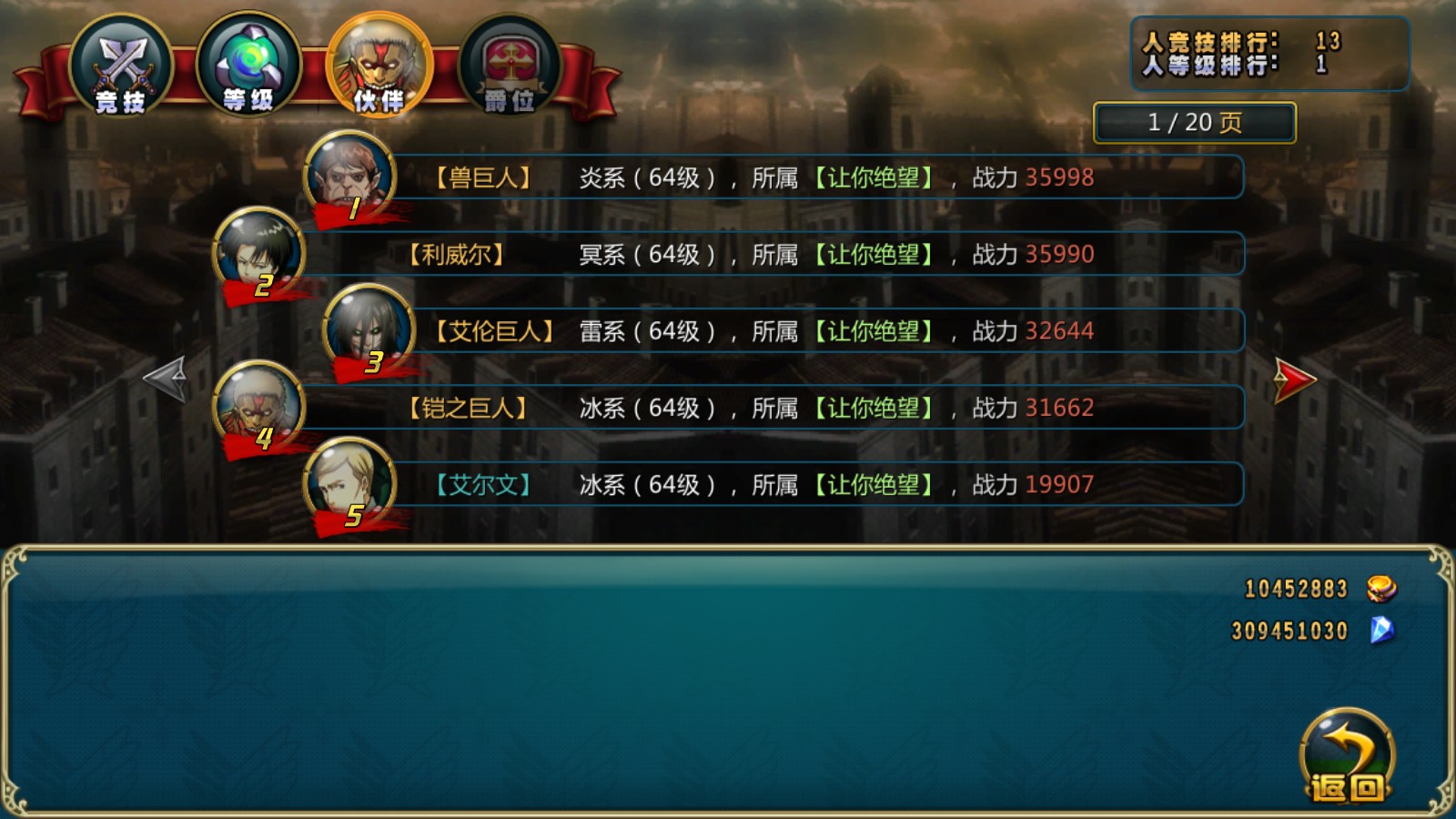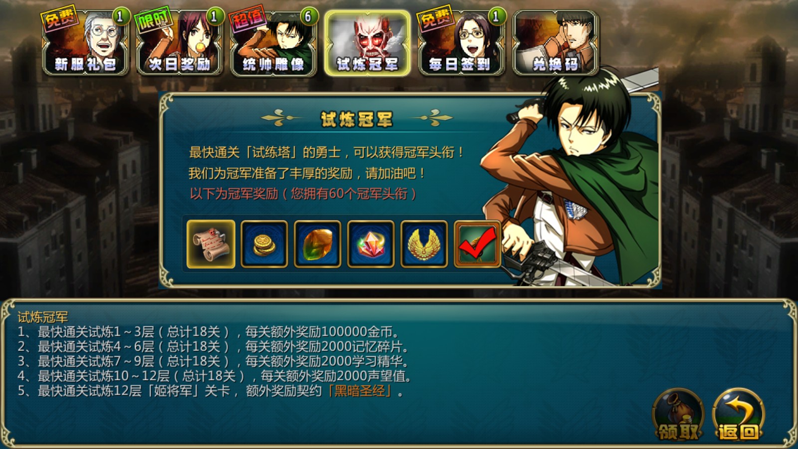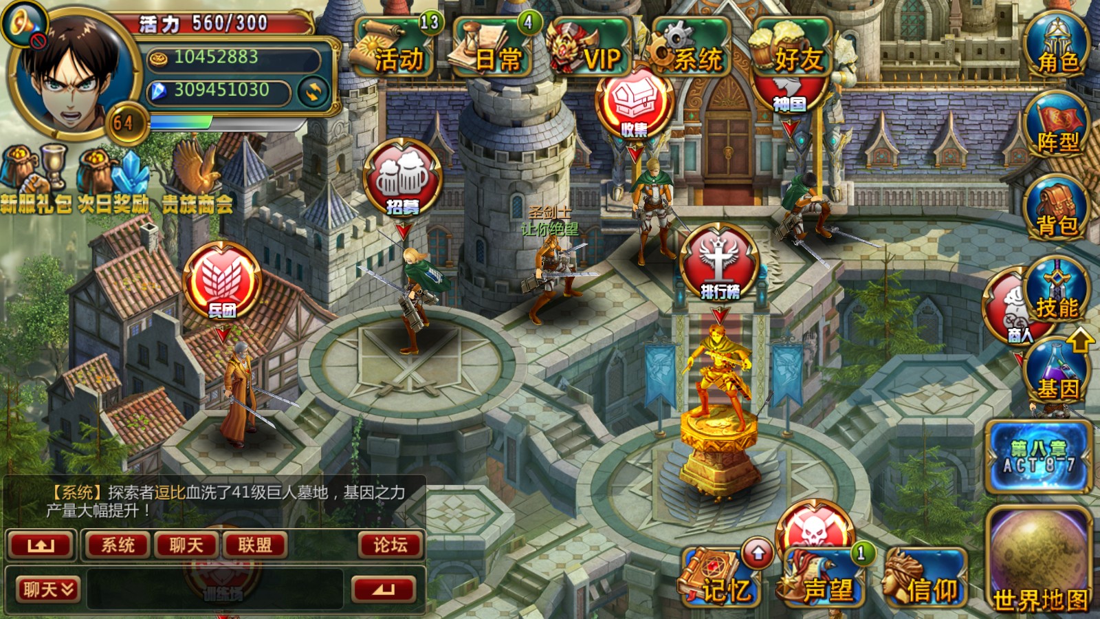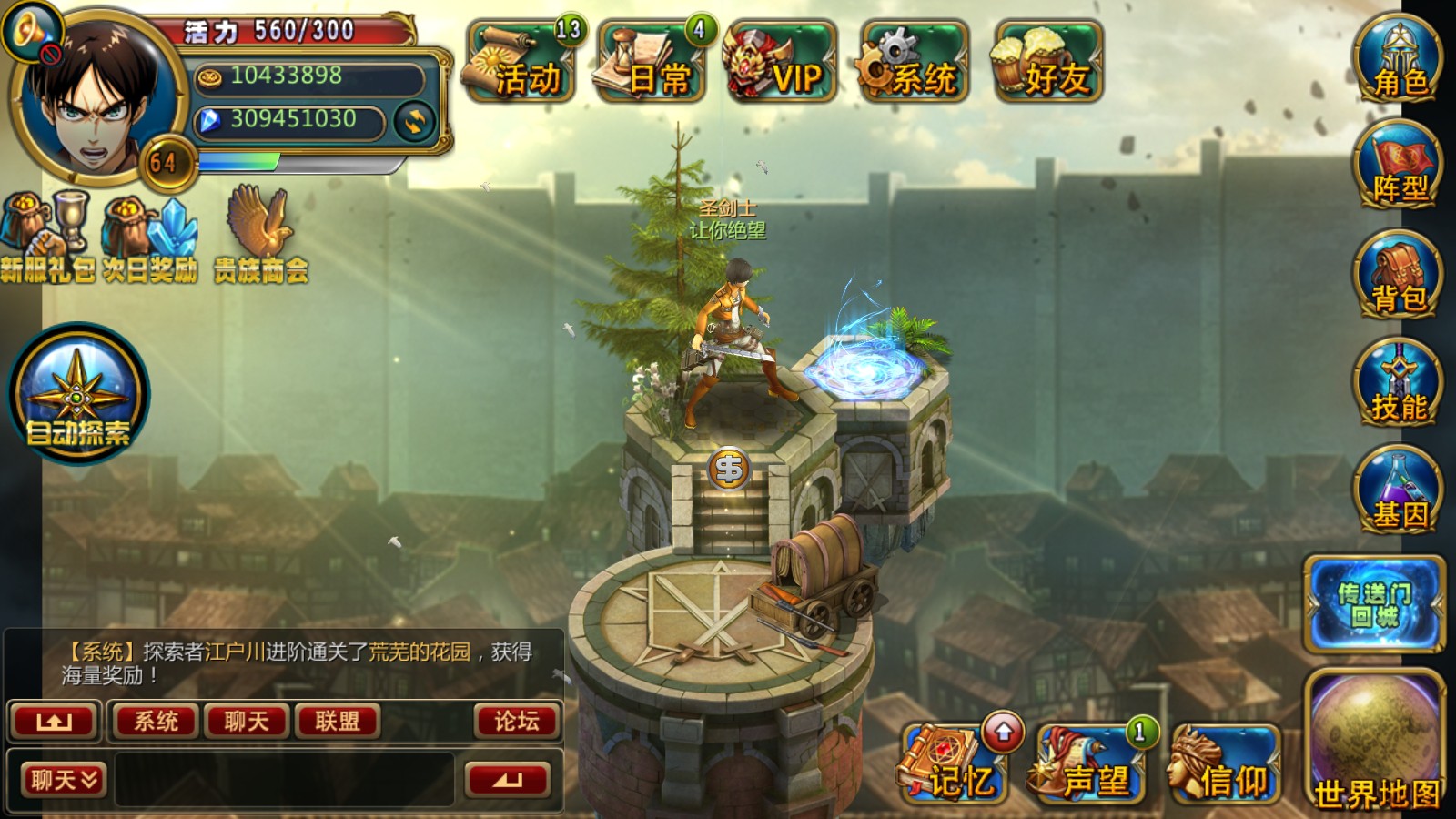 《进击的世界》是以动漫《進擊の巨人》故事情节为背景制作而成,其高度还原动漫情节,清晰刻画人物角色,明快战斗节奏展现极强代入感。同时多样精彩玩法,千百种华丽搭配,各种奇趣情节设定,复刻经典并融入原创元素形成了一个以竞技、副本、交友、休闲为核心的大型在线回合制游戏。